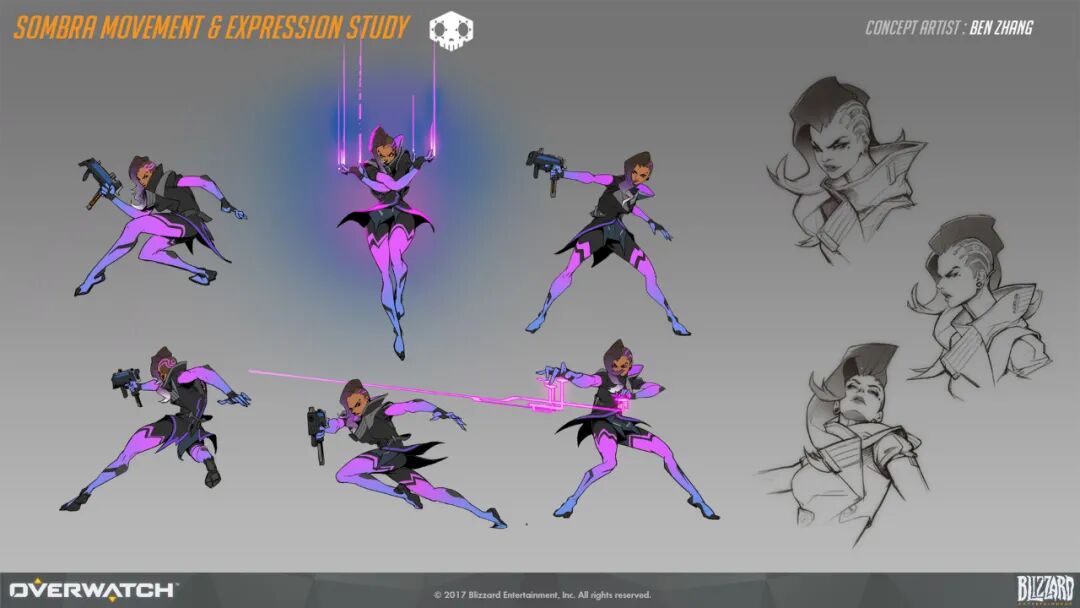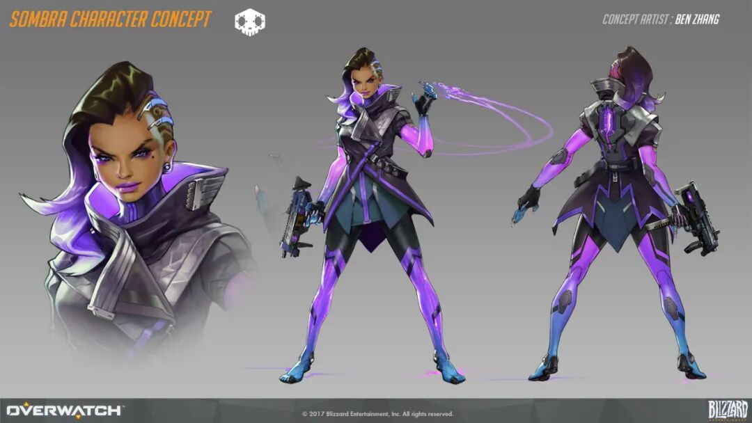 张斌:我个人的话还是最喜欢黑影这个角色,原因也很简单,她是我第一个从头至尾设计并完成的角色设计。我在守望里负责的工作有很多,但在此之前一直都忙于场景,武器以及特效等的设计工作,从黑影开始,我的工作重心才慢慢转到了角色开发的工作当中。
