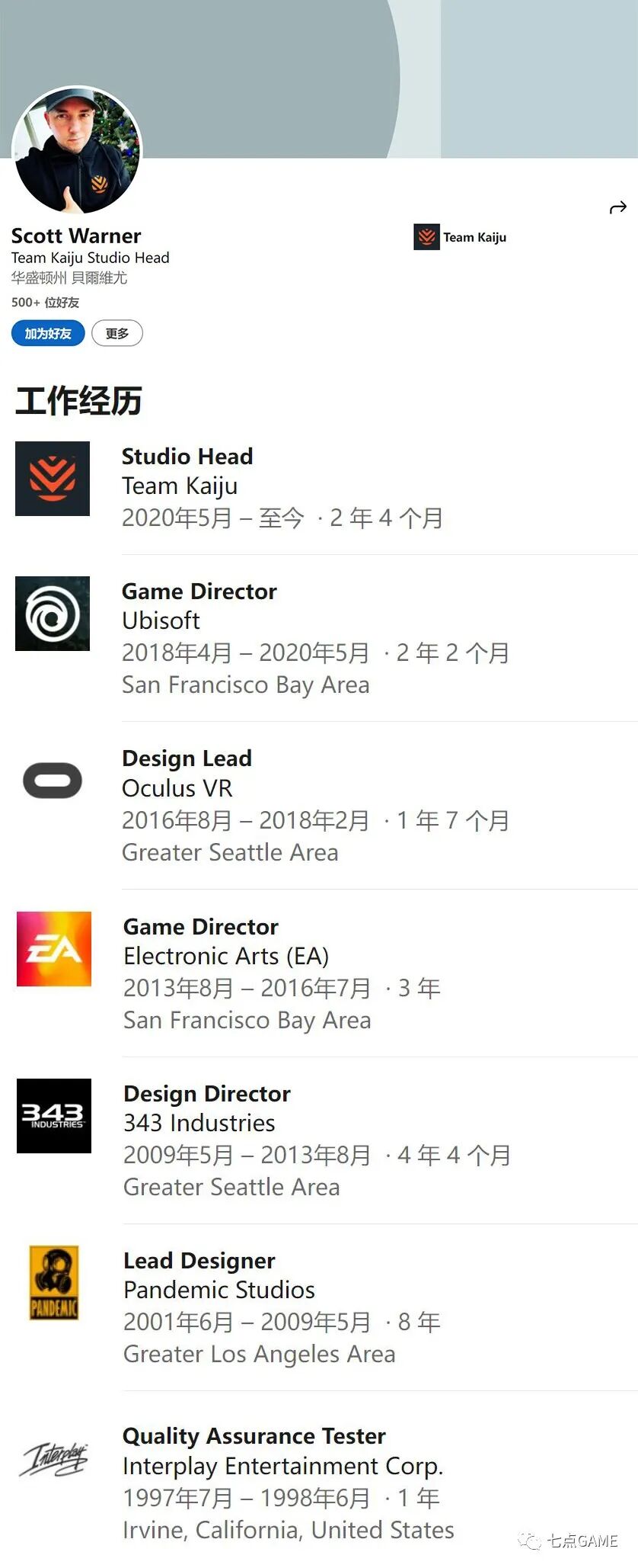 加入一个工作室通常有很多因素要考虑,知道Scott Warner和Brad Welch也在这里,是最开始吸引我考虑天美的原因。他们在开局团队(Team Kaiju)分别担任团队负责人和策划总监。我曾和Scott以及Brad在《光环4》和《光环5》共事,我一直对他们有极高的敬意。当然其他因素也非常重要,比如项目的方向和潜力、团队的能力和经验,以及跟我接触的联系人从第一天就保持了非常高的专业度。这些都促成了我最后的决定。”
