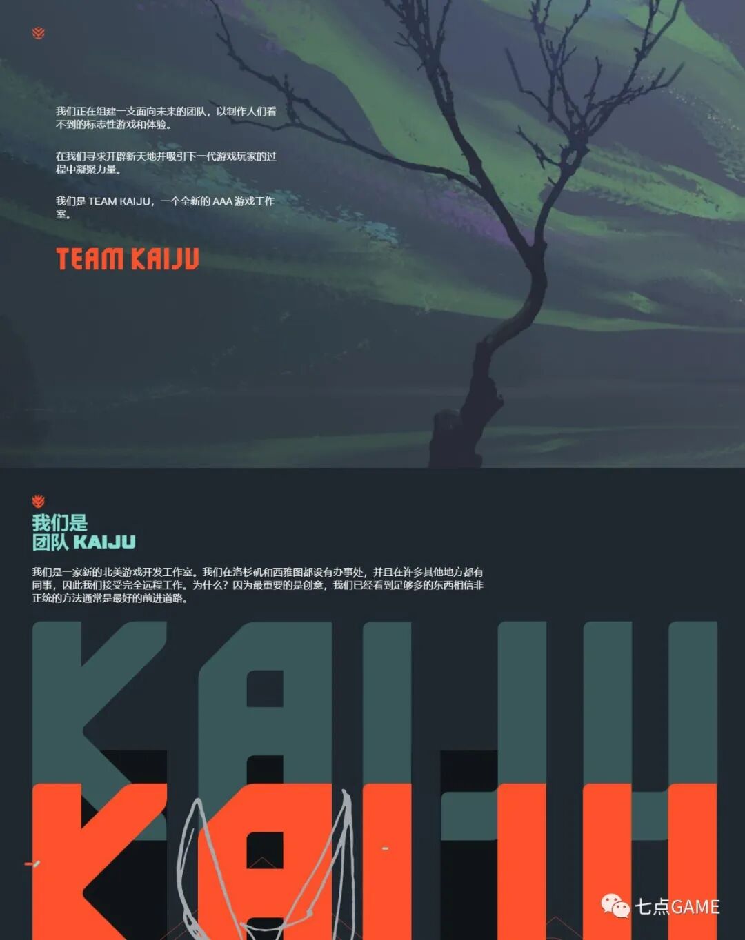 Kaiju在中文里“开局”意为新的开始;Kaiju在英文意思是“怪兽”,是全球流行文化的一部分,但其根源是中国传统文化《山海经》。“奇怪的野兽”也是这个团队在AAA游戏领域的写照——意在用不一样的作品撼动一个已经竞争异常激烈的领域——多人FPS。目前,其项目已研发超过两年,是天美最早启动的一批全球化研发项目之一。