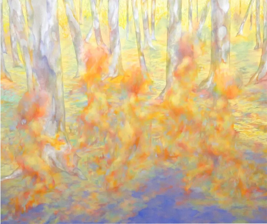 同时,她的作品营造出柔和的空气感,奇幻的色彩和韵律感超越了绘画的边界,我们似乎能从画中感受到声音的存在。