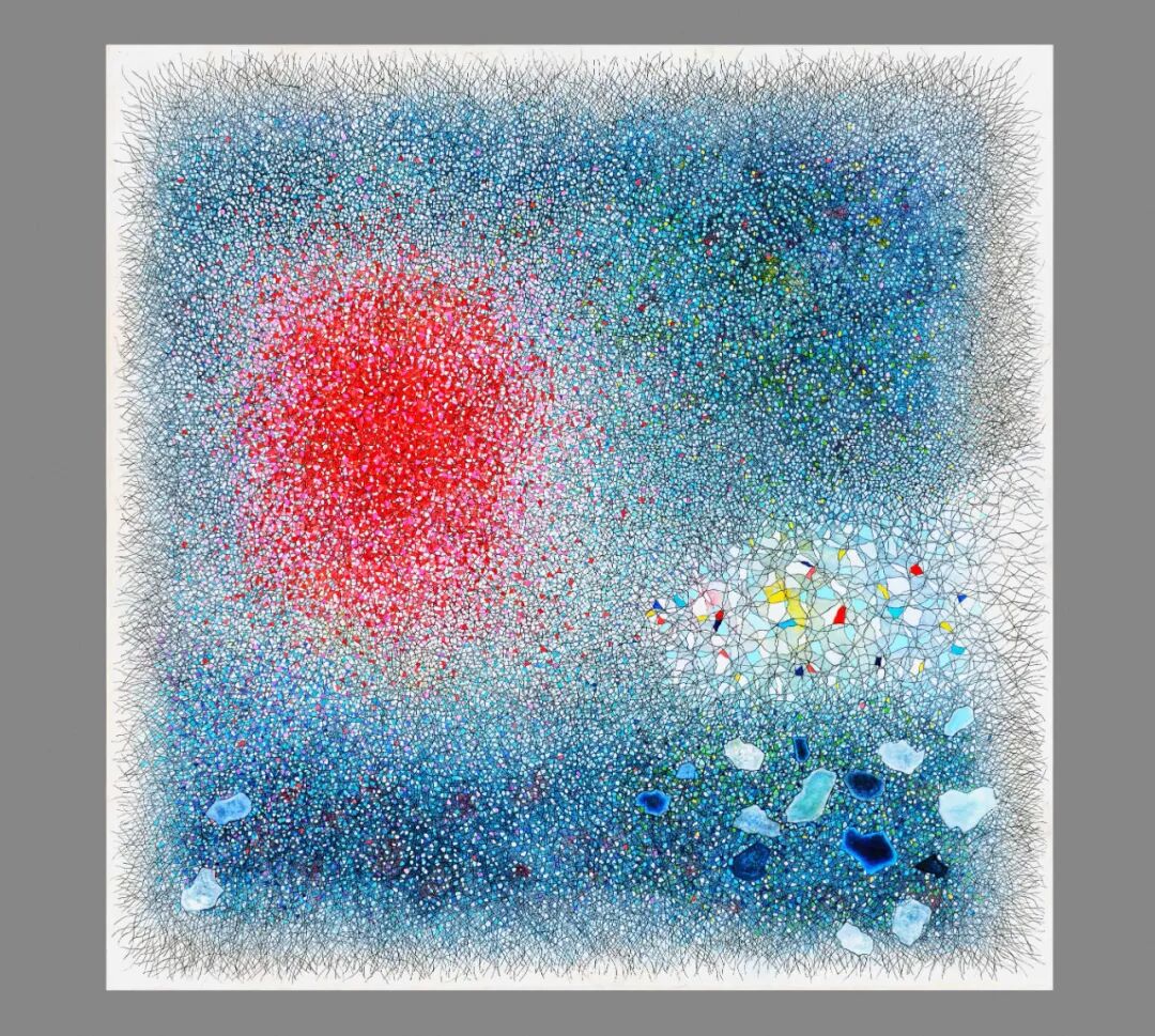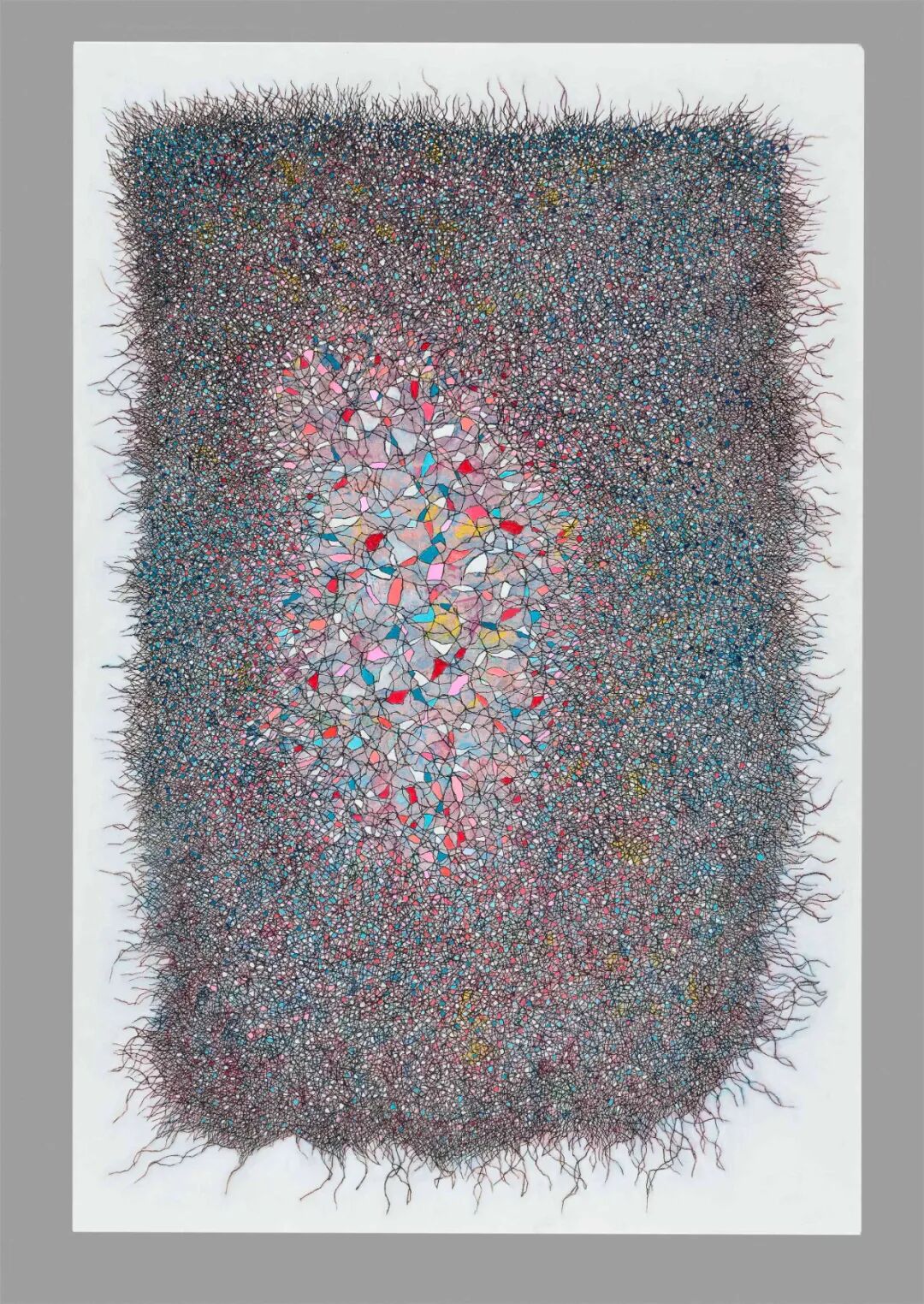 内田江美的作品展示方式让人印象深刻。远处乍看,像是色块构成的画面,但是走近就会发现,极小的空间内充溢着红色,蓝色,黄色等色彩,无数的线曲折重合,像人的神经细胞一样密切相连。
