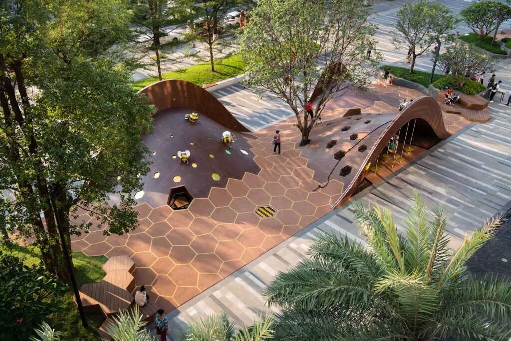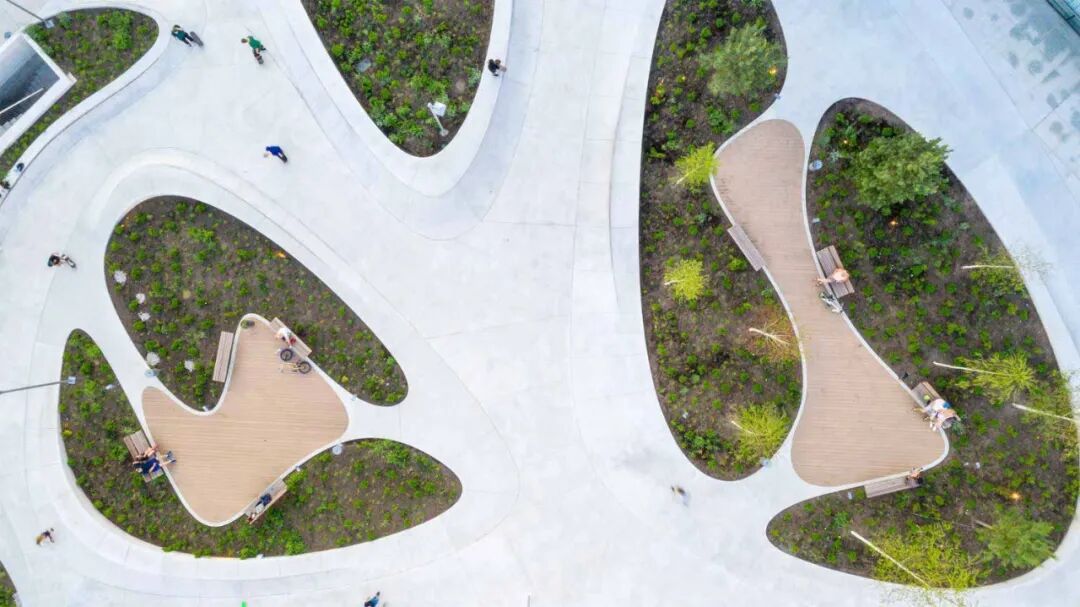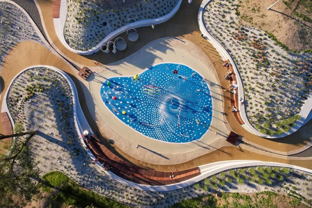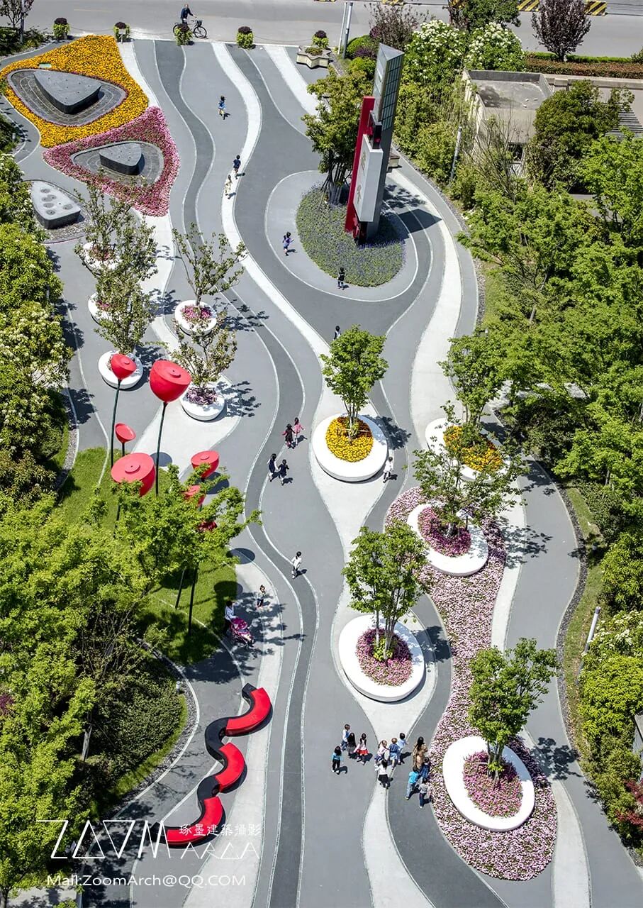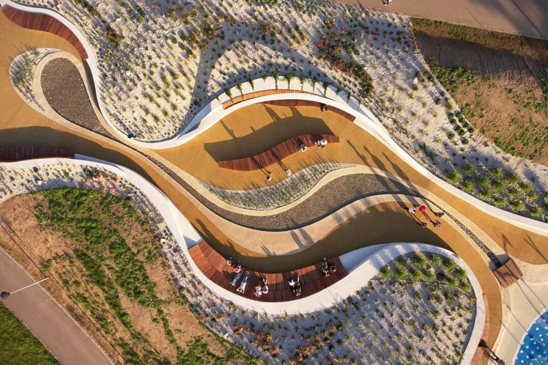 曲线形状的长椅创造出一个绿色和安静的休息场所,可供家长使用,这也有助于他们照顾玩游戏的孩子。五彩缤纷的灌木丛和花草甸的种植设计,使这个场所显得更加有设计感。