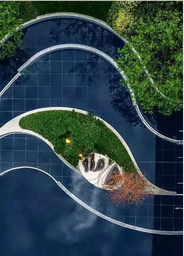 曲线,不同于直线的现代感与稳定感,曲线富有女性特征,具有柔软、优美和弹力的感觉。曲线的整体排列会使人感觉流畅,让人想到自然河流、地形等,具有强烈的心理暗示作用,而曲线的不整齐排列会使人感觉混乱、无秩序以及自由;自由曲线则具有延伸、流畅及富有弹性的美。在实际应用中,徒手绘制的线能给人以自然流畅之感,借助工具绘制的线则显得理性和生硬,所以我们往往在做景观设计方案之前会进行手绘草图的练习