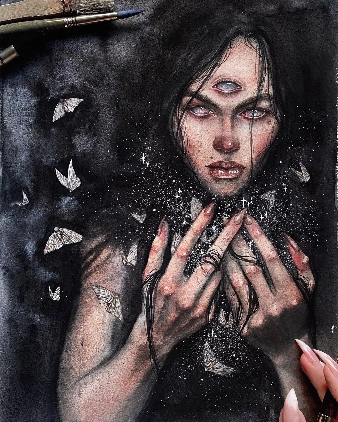 或是圣洁的,或是鬼魅的,Nastya Kuzmina笔下的人物仿佛披上了神秘的纱,无论你揭不揭下,那暗黑的氛围一直笼罩在视线内,冲不破,散不尽。
