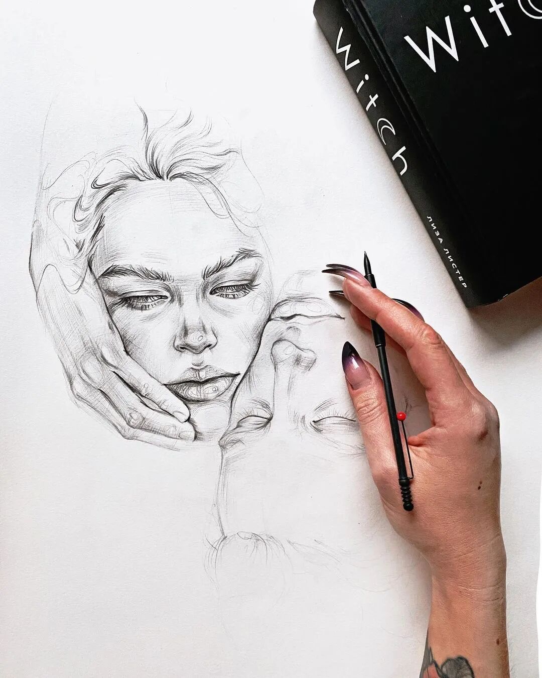 在构图上,Nastya Kuzmina采用详略得当的叙事方式。Nastya Kuzmina并没有将人物完完整整的放置在画面中,而是将想要强调的部分具体绘制。