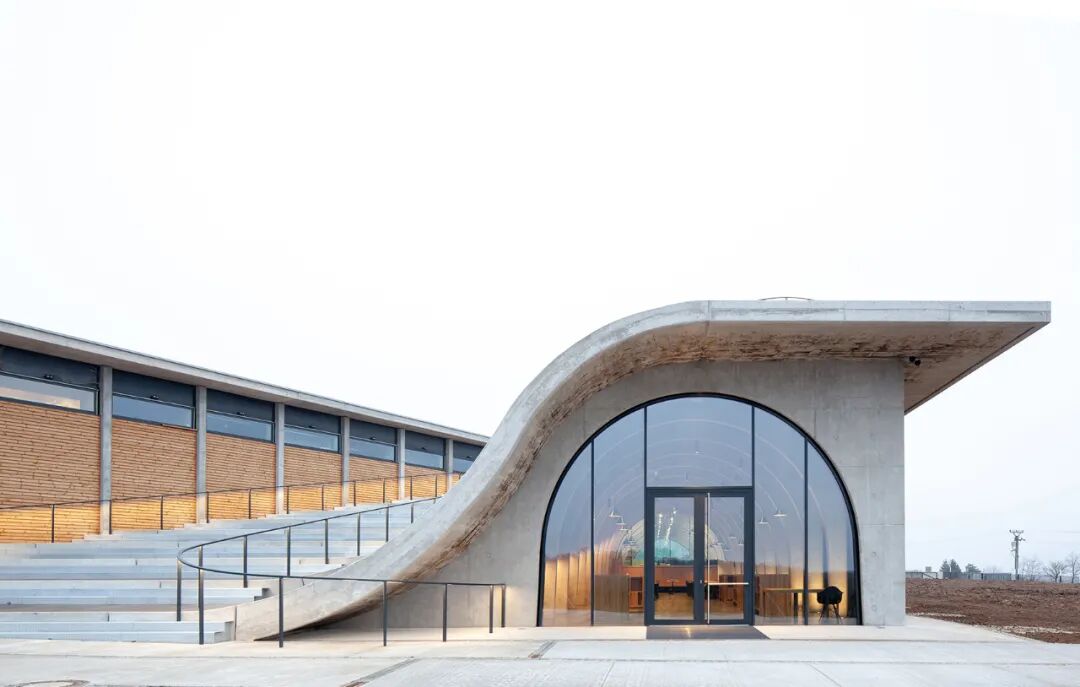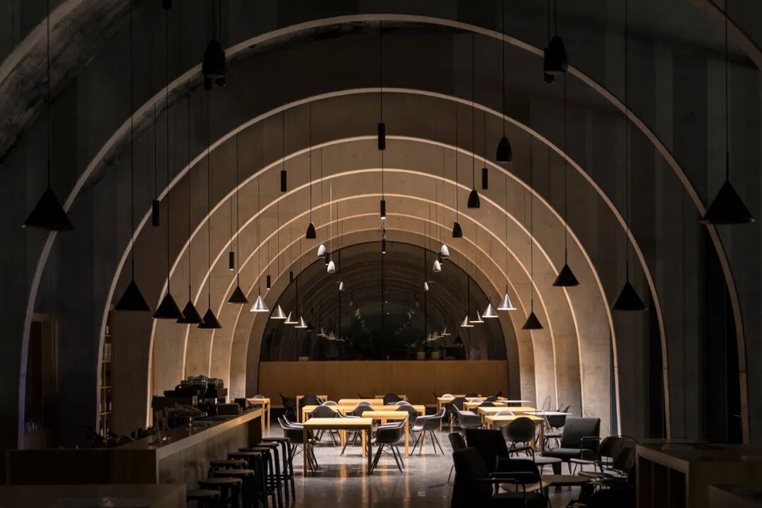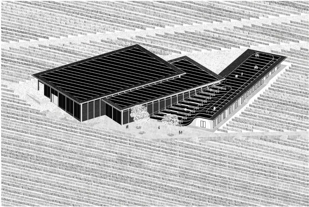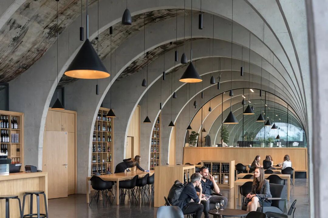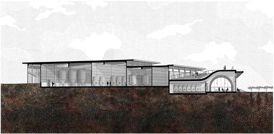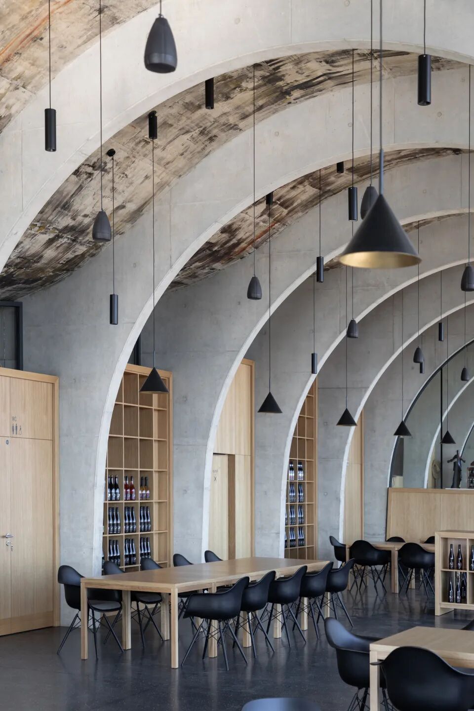 室内的拱顶模仿该地区典型的酒窖,位于成排的拱形梁之上。波浪形的屋顶被用作露天剧场,与酒窖的弧线相对应,举办文化活动时,对当地人和游客开放,使酿酒厂融入其所在的土地与文化之中。