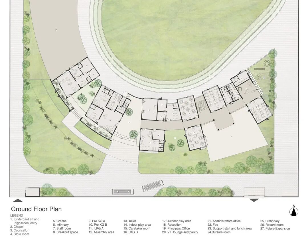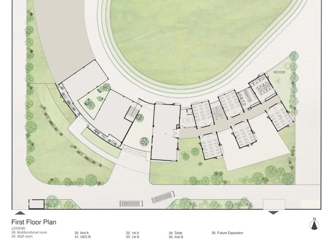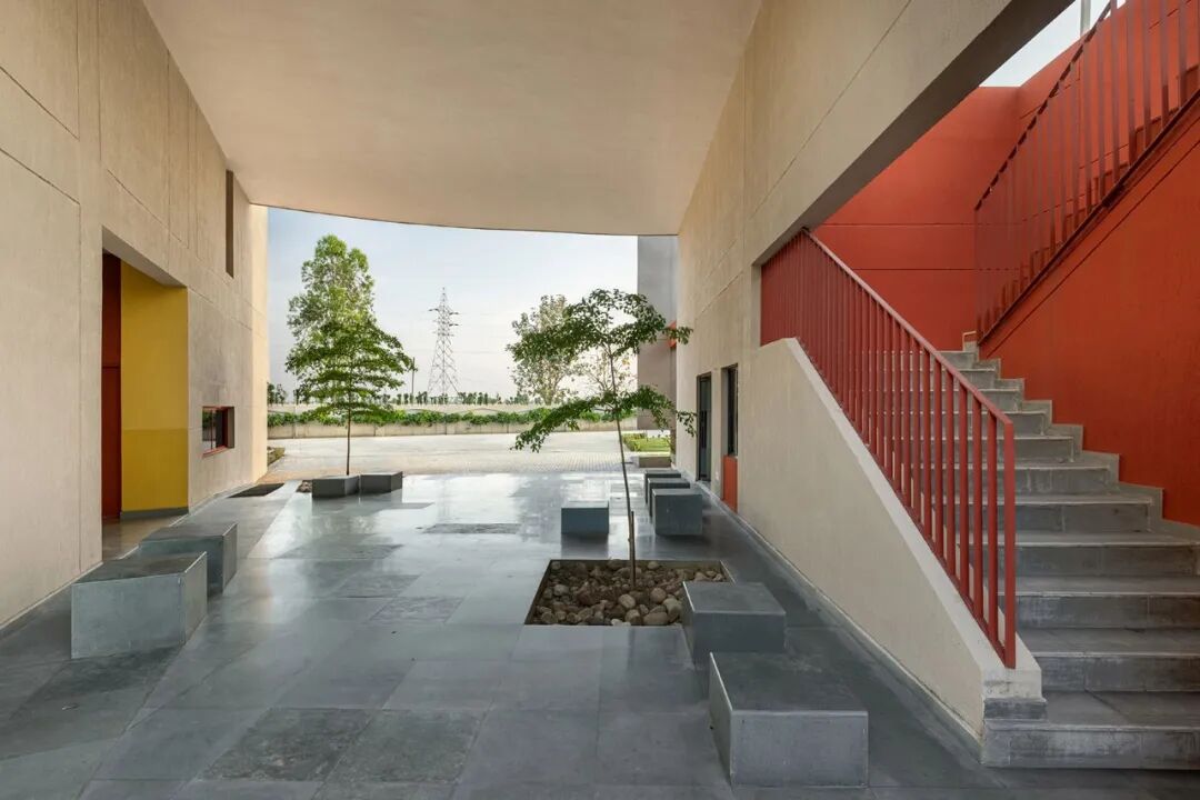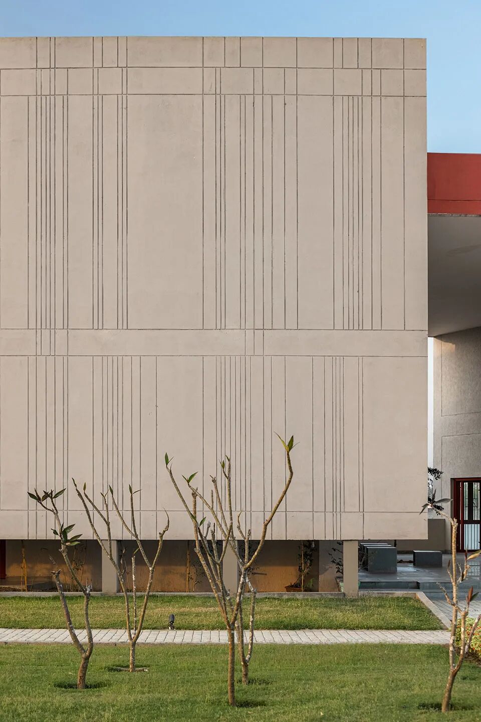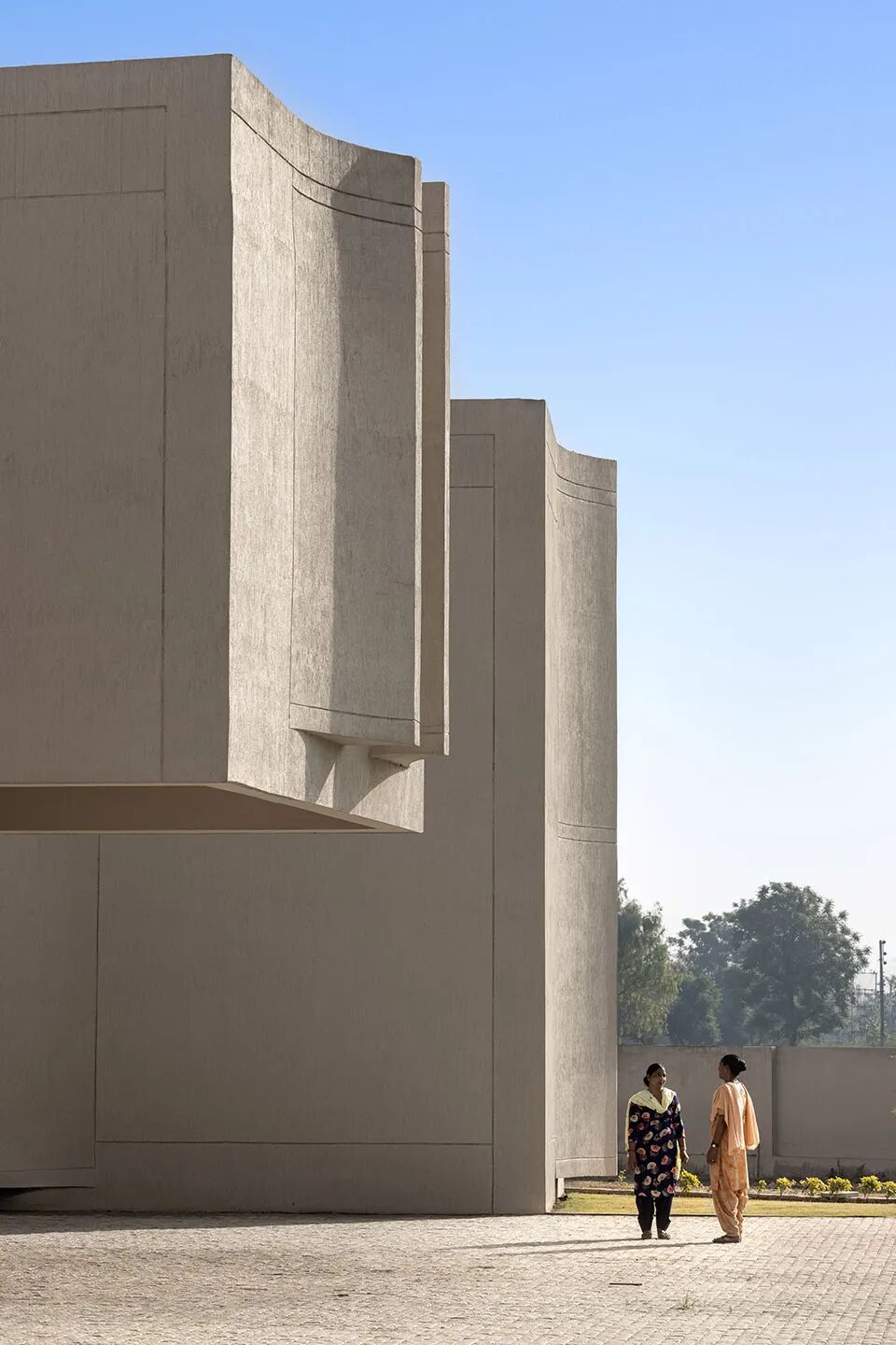 St Martha Bethany Vidyalaya学校就坐落于这样的气候区中,当地气候特征催生出建筑体量的弧形演变,堡垒般的空白墙壁旨在使阵风发生偏转,并将它们引向建筑体量中更加柔和的开敞部位。