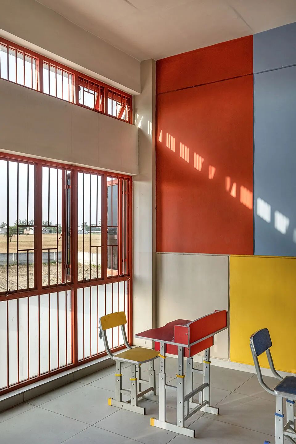 不同于建筑外部简洁而纯净的立面,为了营造轻松活泼的学习环境,设计师将红黄蓝三色融入室内装饰,激发了空间活力。