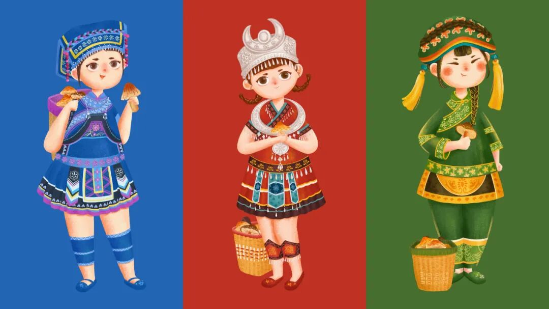 不同颜色、款式的民族服饰的小姑娘
