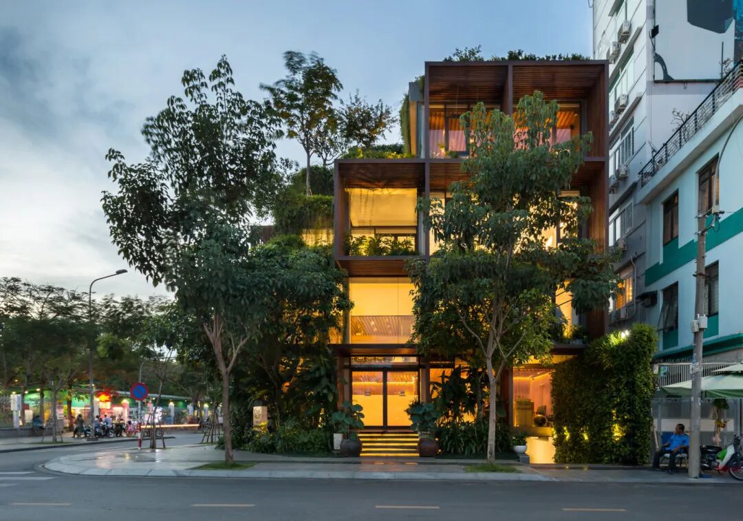这家办公室位于胡志明市第4区,区域内建筑比例很高,大部分已建成的建筑用作商业中心和办公总部。场地位于一个丁字路口,可以看到公共公园和广场,但建筑的两个主要立面从黄昏到黎明都受到阳光直射,给室内造成了很大的过热问题。