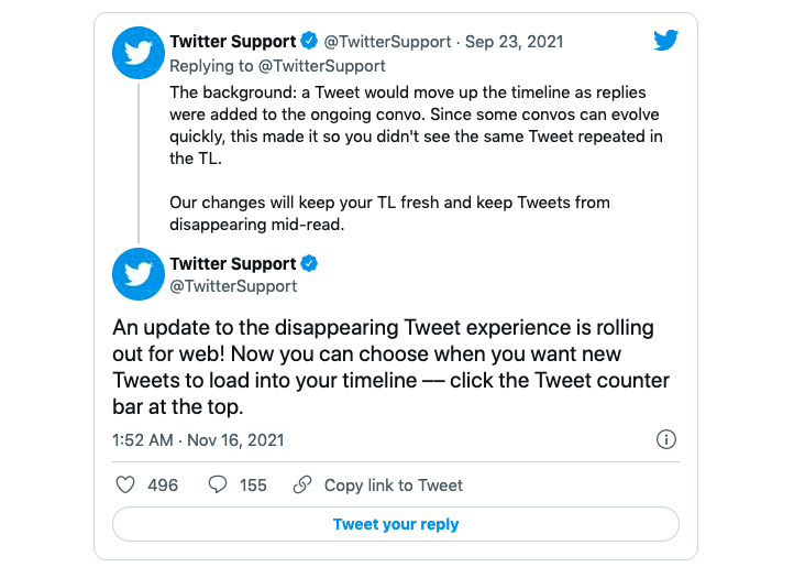 九月底,Twitter 表示将解决长期存在的一个问题——如果您经常使用该服务,您可能已经注意到推文有时会在您阅读某条推文时从视图中消失。当时,该公司表示已计划进行多次更新以解决该问题,目前为止的解决方案为:单击界面顶部的推文计数器,您可以选择何时将新推文加载到您的时间线中。但至今仍然没有更好的解决方法。