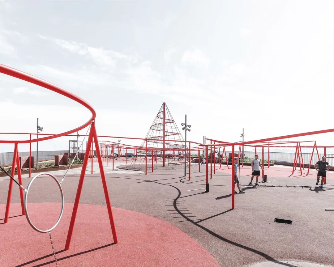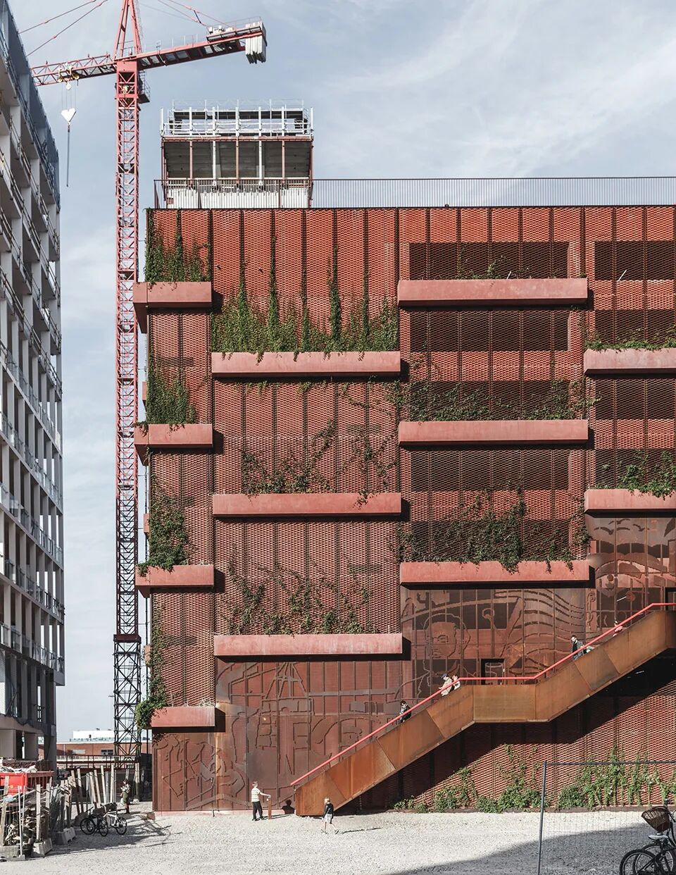 立面上的植物箱网格被两个大型公共楼梯穿透,这些楼梯的栏杆延续到屋顶,从单纯的栏杆,变成了秋千、球笼、丛林健身房等等,创造了似游乐场般的活动空间。