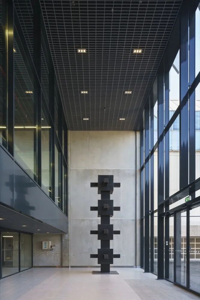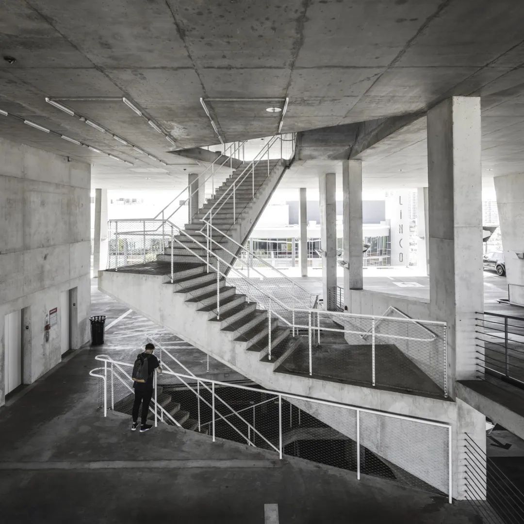 建筑中心有一座开放式、雕塑般的楼梯,使车库中的行人流通成为一种全景、仪式般的体验,仿佛开着车穿梭于楼层之间