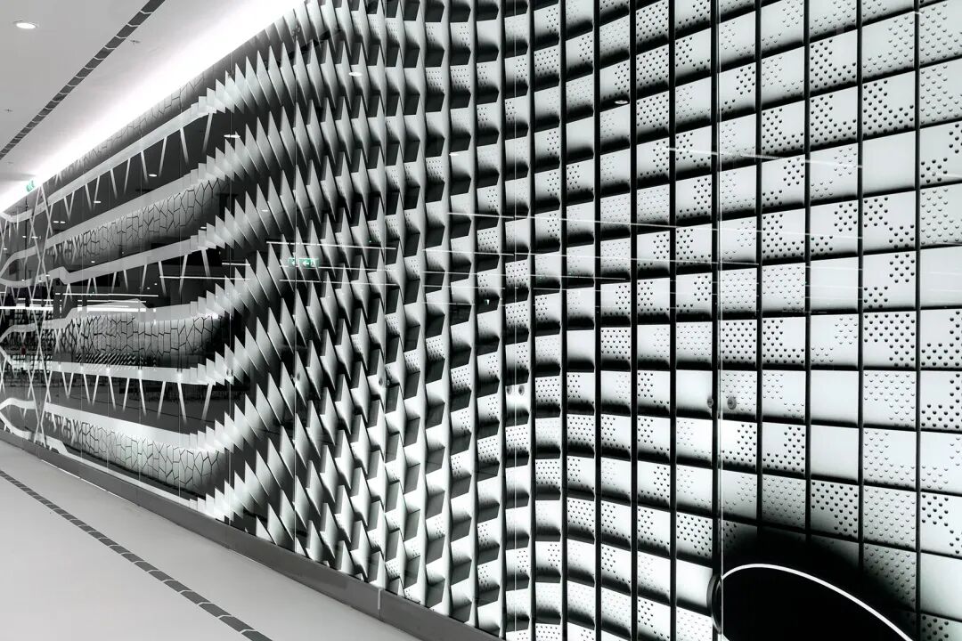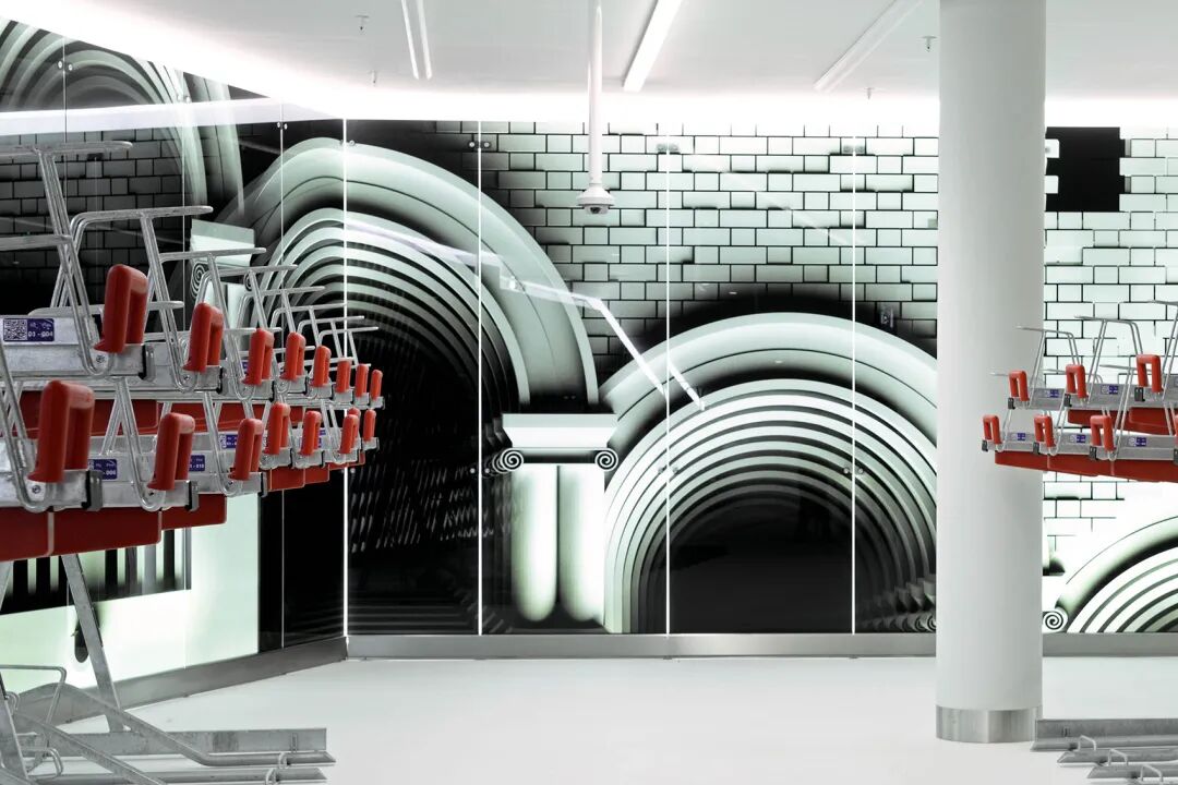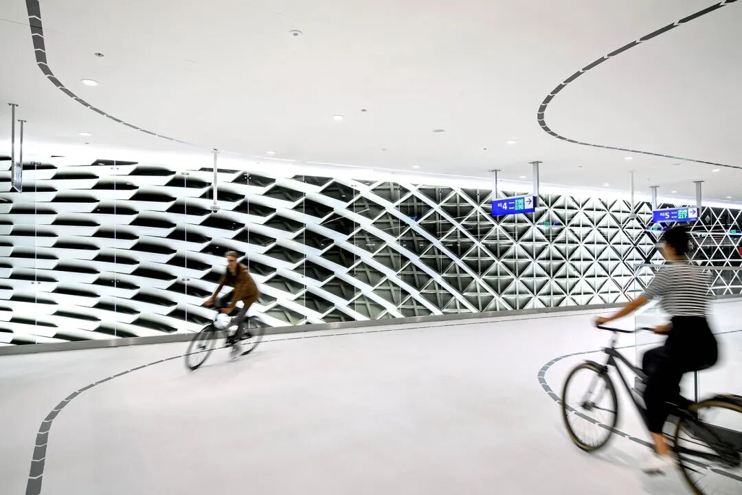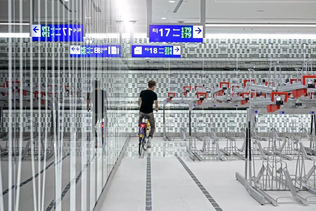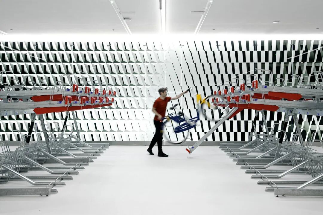 这是荷兰最大的自行车停车场之一,应用数字化的设计理念,将黑色和白色搭在一起作为主元素,构建了如同博物馆般的梦幻空间