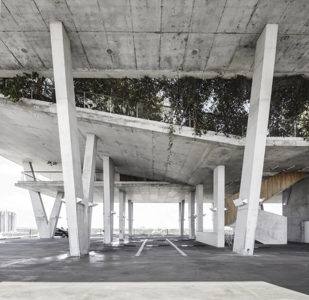 结构本身亦是一件建筑艺术品。停车场由楼板、柱子、坡道组成,一层一层棱角分明的混凝土楼板,被不同形态的混凝土柱子顶起,有独特的结构之美。