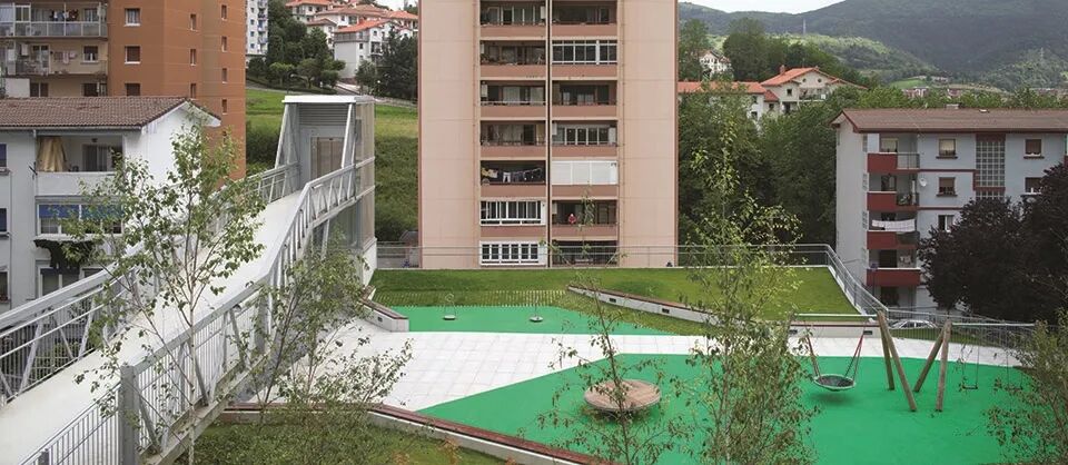 停车场不仅完美地与地形结合,削弱体量感,还为周边的居民提供了活动空间,很好地融入了居民的生活,成为居民日常活动的主要地点。