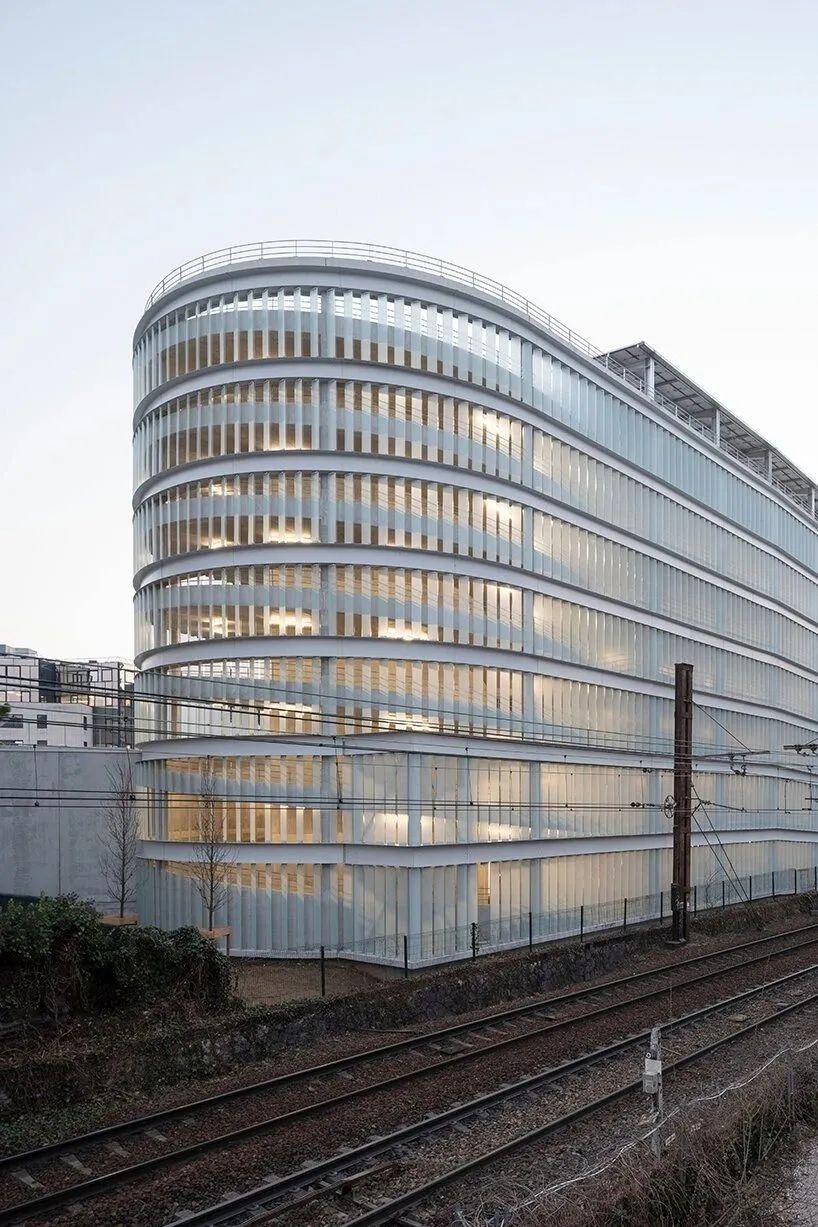 ‘The facades are 50% empty, so the car park is considered exempt from fire regulations, and they are clad in vertical glass strips placed at 45° (60% recycled glass and enameled to be opalescent). The empty gaps create a variety of additional views of the city. By day, the functionality of the building is on full display. By night, perceptions change thanks to indoor lighting that softly etches the urban landscape,’ explains the practice.