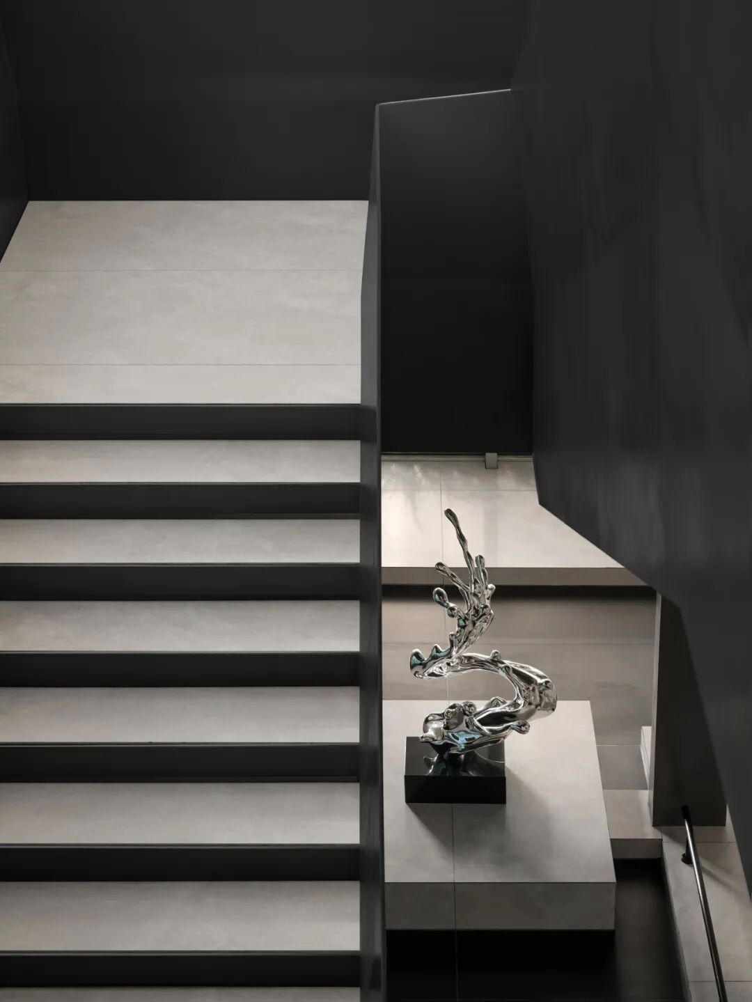 沿楼梯登高,闯入眼帘的异形装置,以大自然里的万物生长之姿接迎,充满生命活力,冷质银光在楼道中闪耀。拾级而上,质感黑白瞬变为原木格调,横向视觉设计平缓接洽,更显通透简洁。