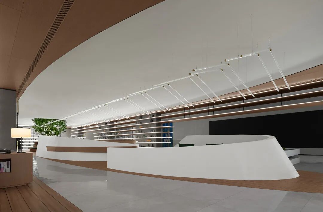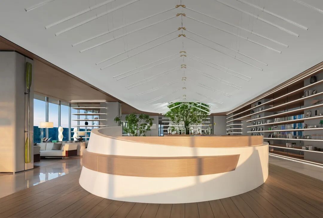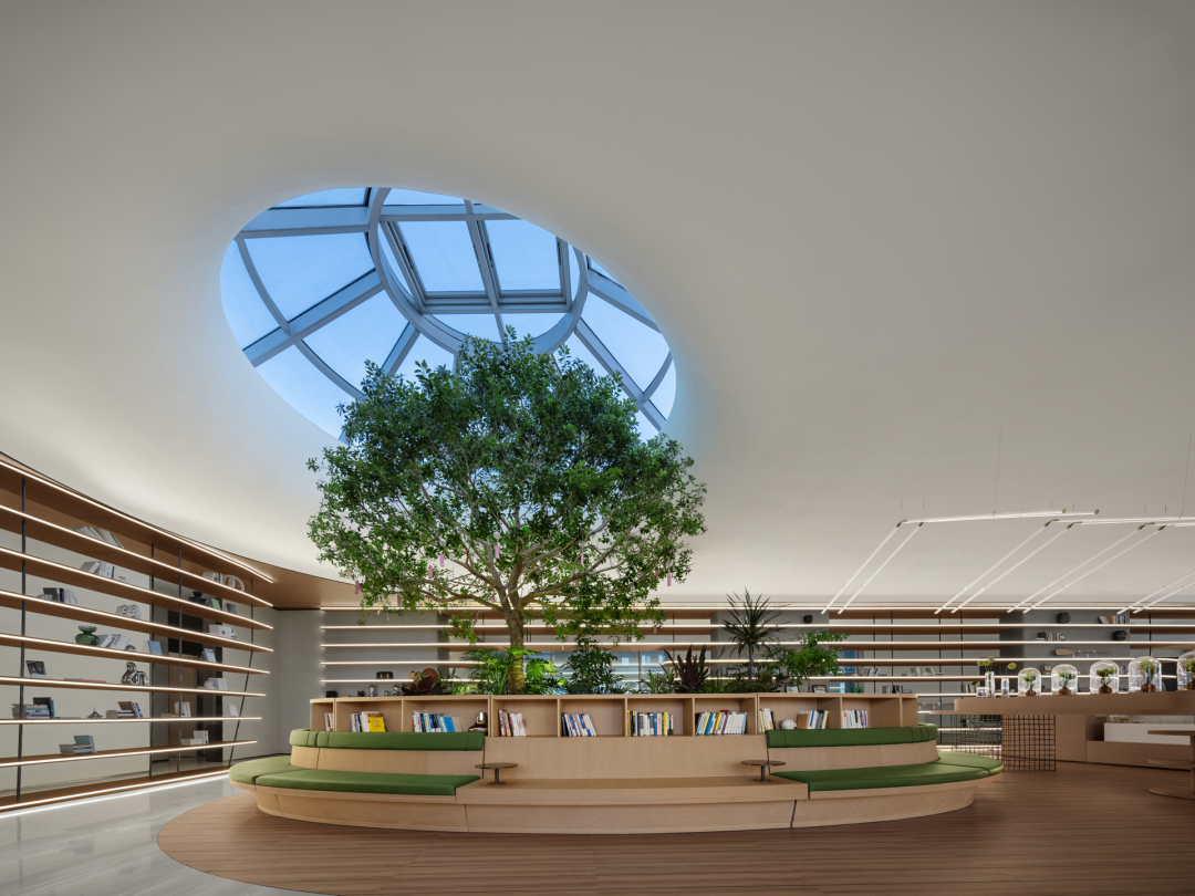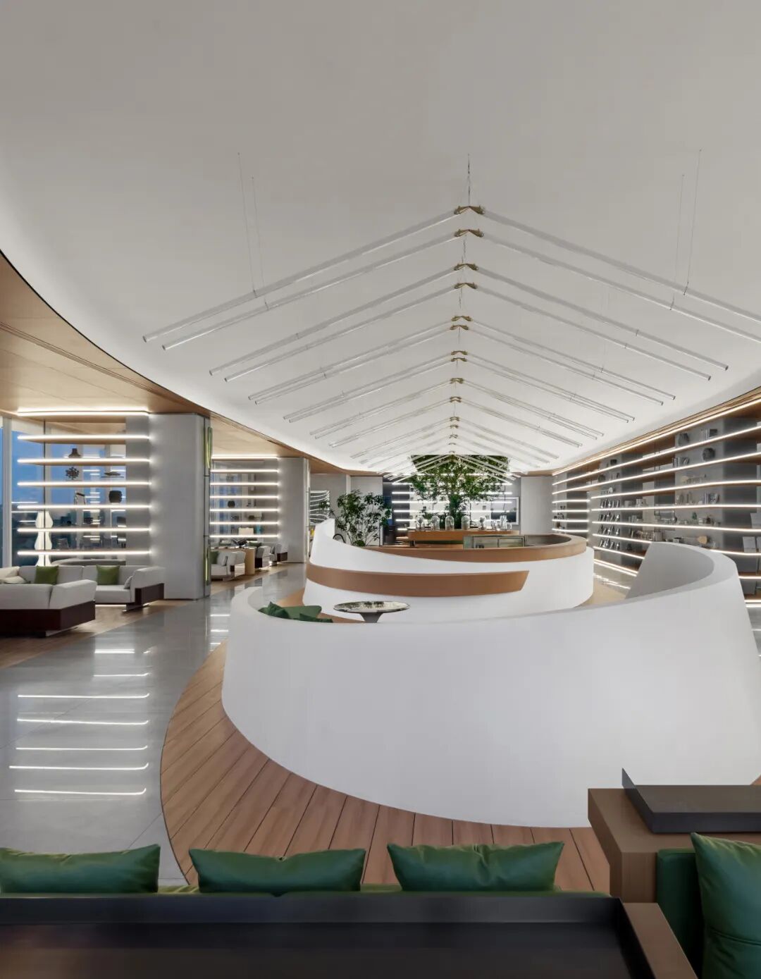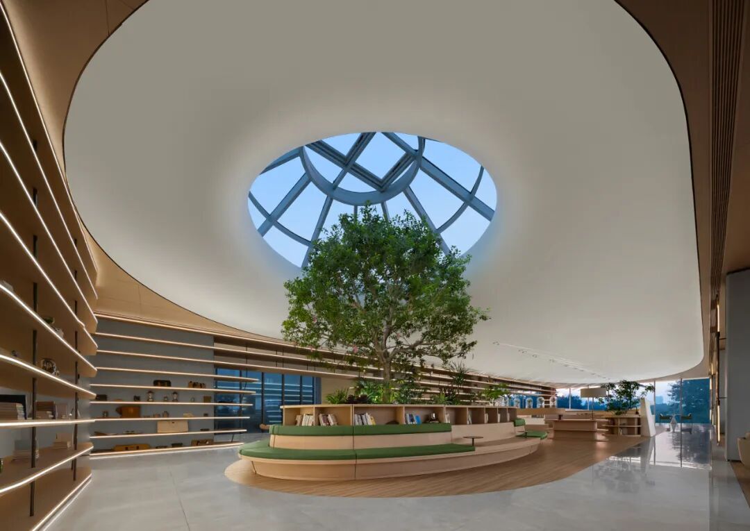 洽谈区以自然生态为出发点,将生态理念融入到空间的连贯设计中;阳光穿透绿叶,滋养出丰盈的生命,趋光而向穹顶,呈现无尽的蓬勃生机;船状的天花,无声映对,更营造出人与自然无界共生之感。