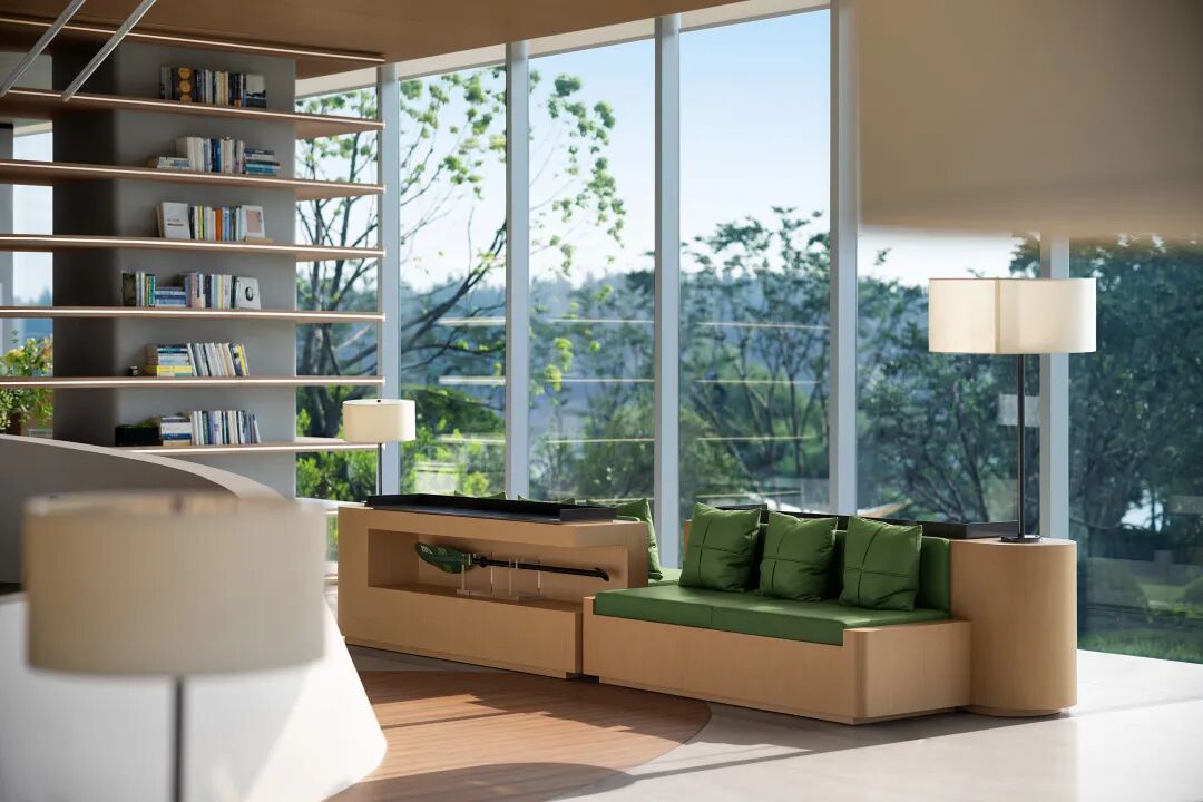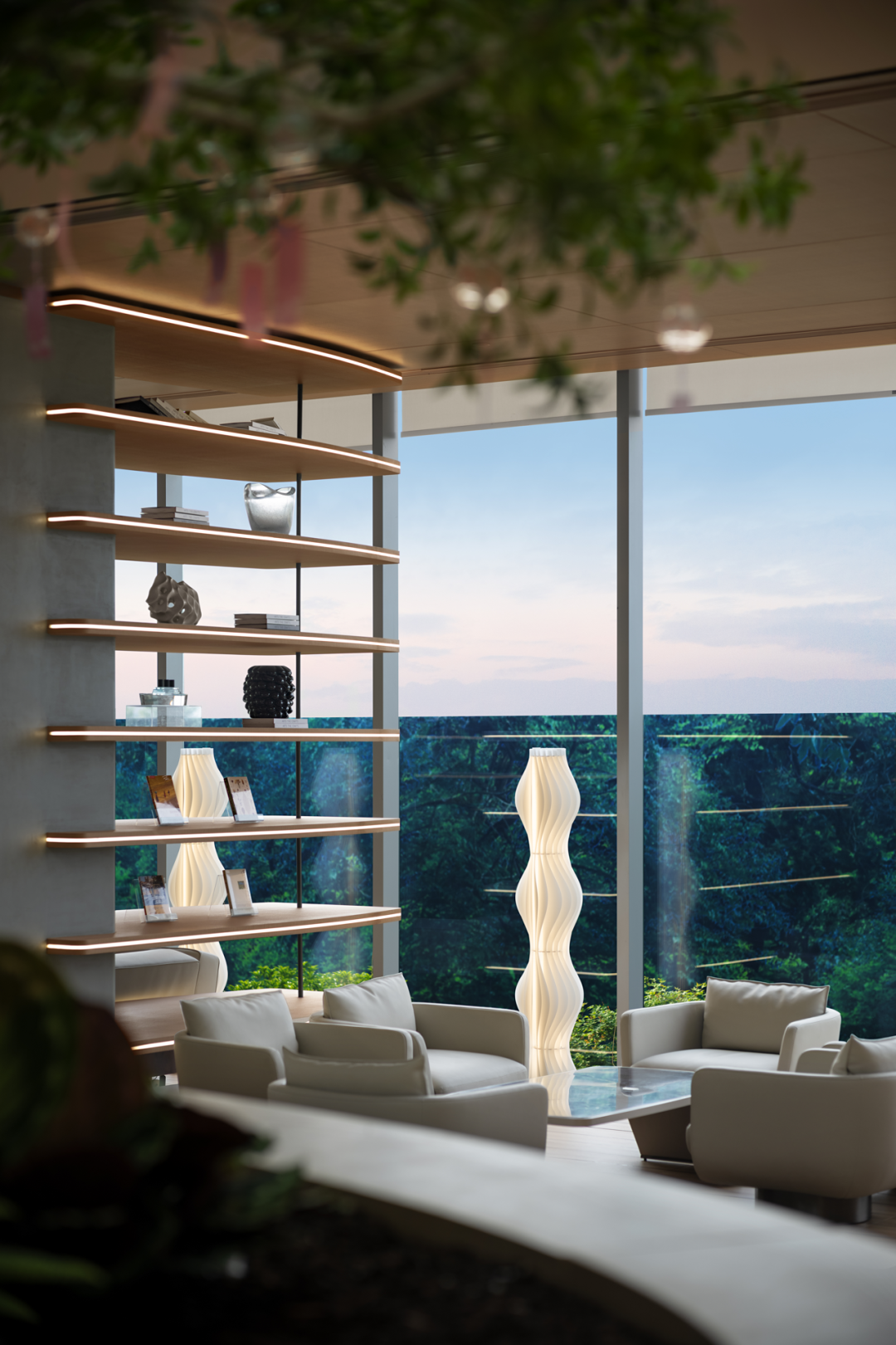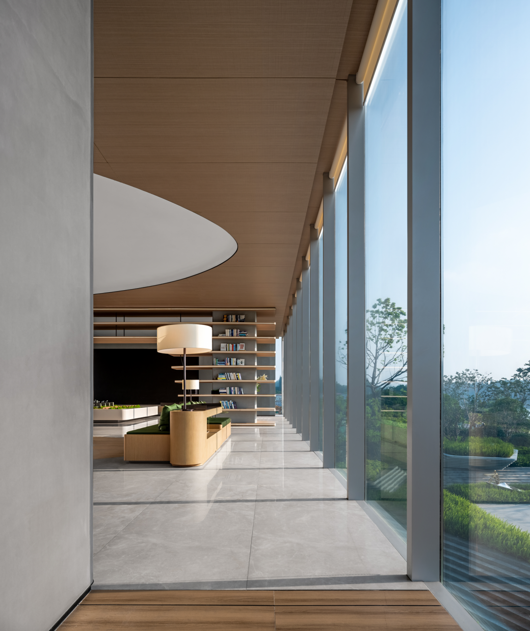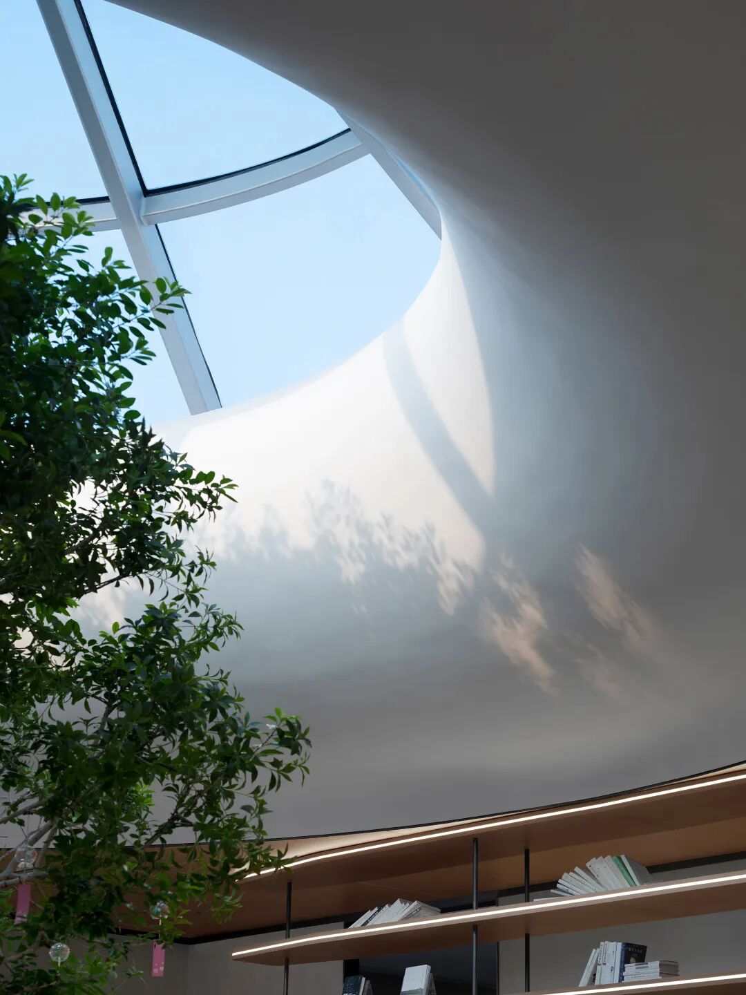 洽谈区以自然生态为出发点,将生态理念融入到空间的连贯设计中;阳光穿透绿叶,滋养出丰盈的生命,趋光而向穹顶,呈现无尽的蓬勃生机;船状的天花,无声映对,更营造出人与自然无界共生之感。