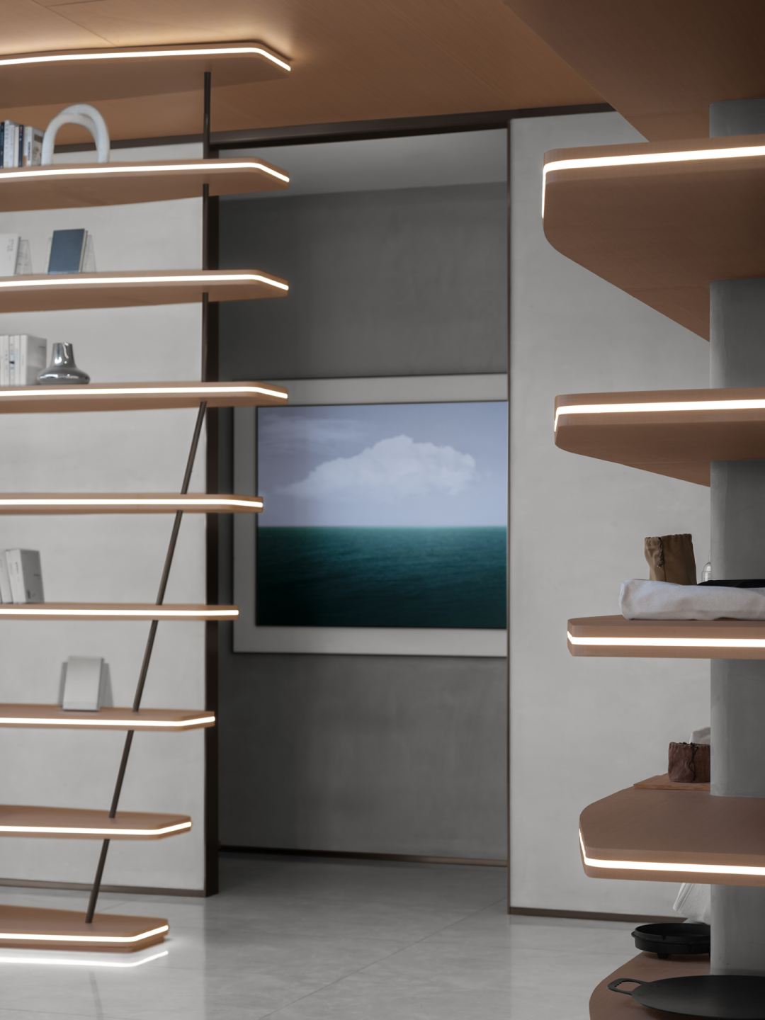 休闲区取“船桨”之形态而制的艺术灯管犹如一位舞者,在木色与白色交织的空间里,时而奋力摆动,时而静止停摆,在生活的特写镜头下交织舞动,彰显着自由而又充满灵性的动感。