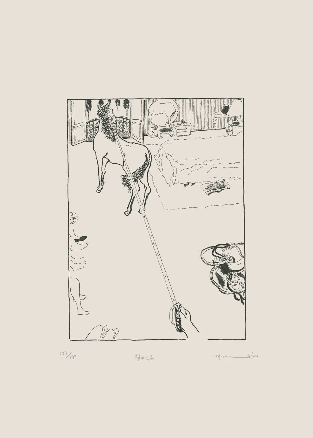 梦境一般,有人牵着马,这匹马在照镜子。仔细看,牵马的不是普通缰绳,像一种弹性牵狗绳,更是一种卷尺。周围有一个床,很多人坐在那里,在干什么,包括那本鲸鱼画册,出现这样的画面,读者可以想象。