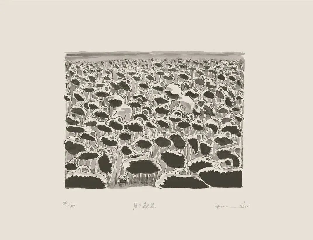 以前写一篇文章《过年》的新插图,年轻时我在东北,那里有大片大片的葵花地,当时供应匮乏,等葵花成熟了,年轻人都是晚上,趁着夜色去偷摘葵花。两人带一麻袋,一把镰刀,带一块搓衣板。一人用镰刀割下葵花,掰两半,另一人火速用搓衣板搓下瓜子,麻袋接着。装满后,背到一个隐秘地方晒干,过年时带回上海。当时就是这样,为了过年,整年要为它做准备。月光下的葵花地特别可怕,葵花都低着脑袋,它的个子,也和人差不多高,去公家的葵花地就怕被人抓,心里总是发慌,也有人说这里是青年们约会的好地方。种种的场景,黑白两种颜色来表现,站在葵花地里,你就是葵花,葵花就是你,是很入画的景象。。