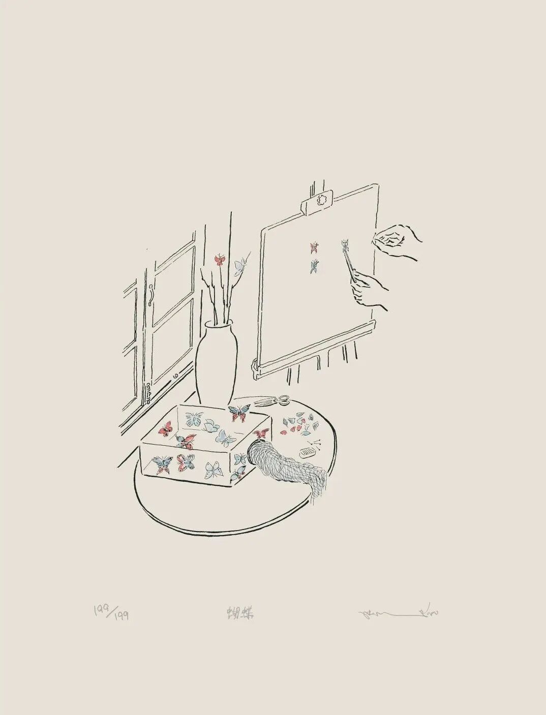 这画的线条整洁,仔细来看,它的现实意义是更明确的——现实生活往往就是把美好的事情破坏掉,把蝴蝶美丽自然的双翅剪去,把它制成某种规范,某种种标本,象征意义十分丰富。