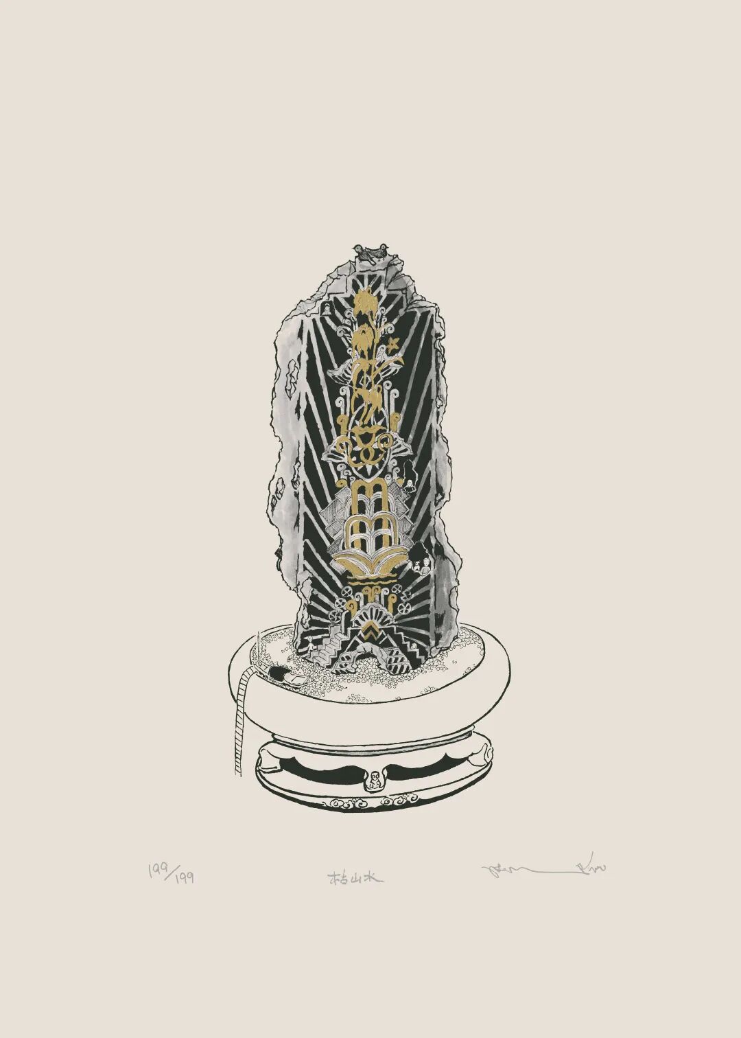 也是沿用传统元素的设想。有人说,这块大石头,很像一段墨,有人说是像一个盆景。如果细看,这些石头山洞里还有人居住,还有楼梯。石头表面的这一些金色的元素,实际是运用了西方装饰艺术的特有花纹,把这些不可能的细节混合在一起,究竟形成了什么?它只给人思考余地。