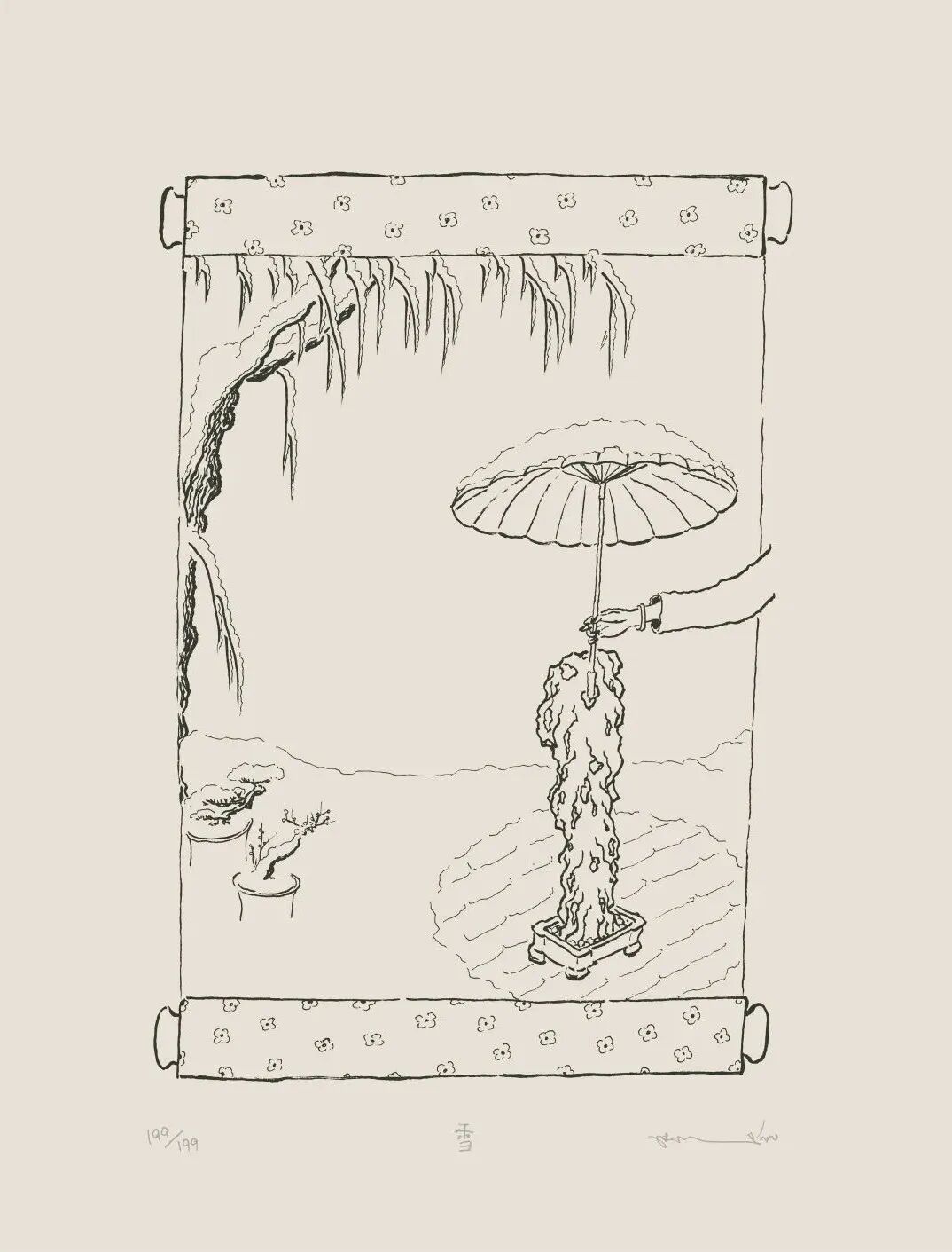 带有东方味道的布局,雪地里,有人撑出一把伞,下面是一块太湖石。用最简单的方式表现一场大雪。至于,那人为什么要给整块太湖石撑伞挡雪?只能解释是我梦中所见。