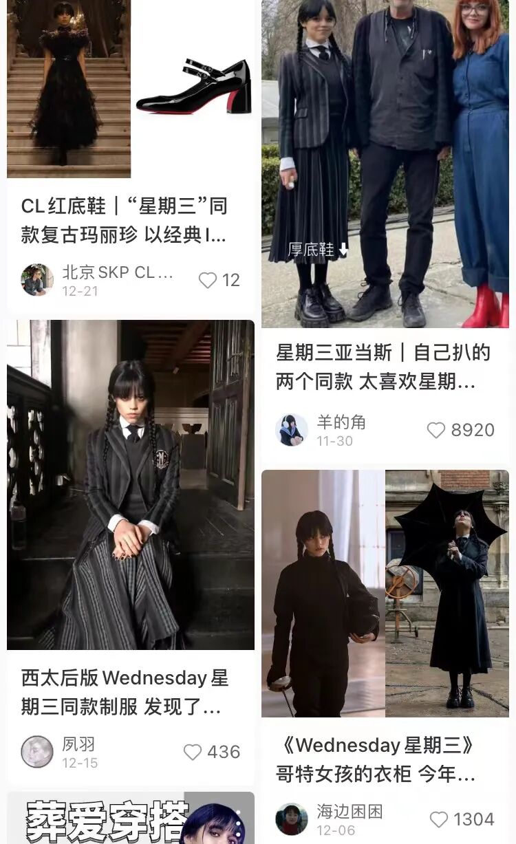年末播出的美剧《星期三》,则让高冷、阴暗的哥特风又火了一把。哥特风的特色是烟熏妆、一身黑、夸张的饰品,更重要的是漠然、颓废甚或病态的气质,营造出极具冲击性,又让人感觉缥缈而疏离的视觉美感。
