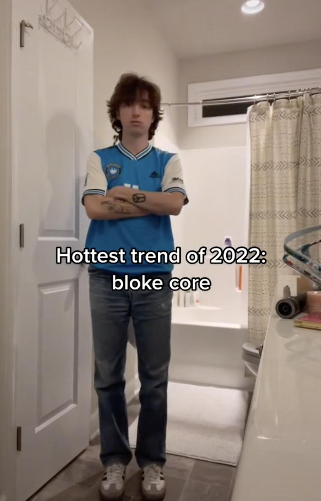 Blokecore就是一名网友自创的。去年12月,用户@brandonlhuntley在Tiktok上发了一则穿着球衣和牛仔裤的短视频,生造了Blokecore这个词组,并自行冠上了“Hottest Trend of 2022”(2022最热流行趋势),本意是调侃当下层出不穷的新潮流,却不想一语成谶:几个月后,#blokecore 突然爆发,吸引大批网友跟风,真成了2022最热流行趋势(之一)。