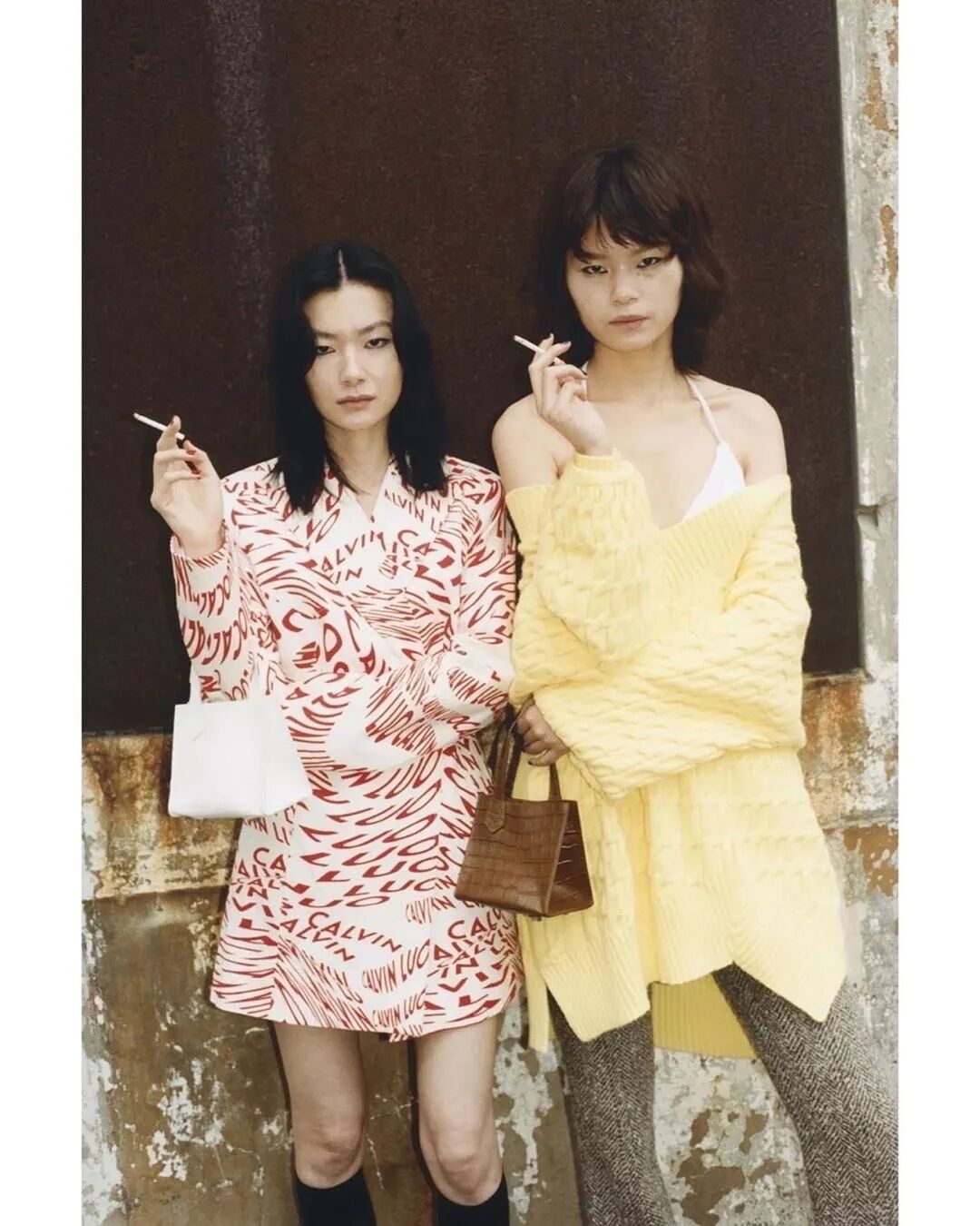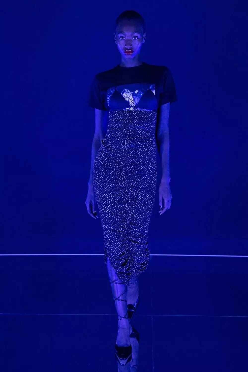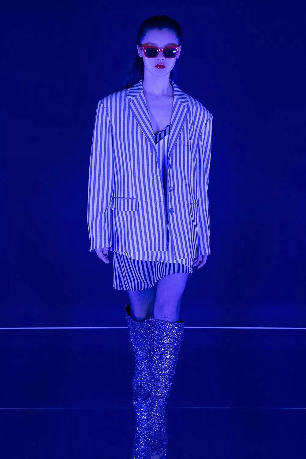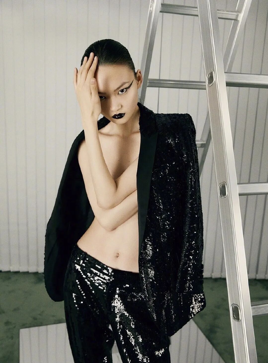 透视的网眼与胸衣装饰宣誓着年轻一代反叛的力量,带有标志性的丹宁与经典法式波点的结合,又好比一场纽约与巴黎、次世代与传统的隔空对话,诠释者CALVIN LUO的桀骜气质。