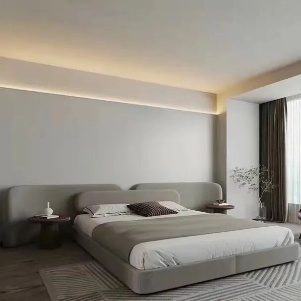 这类铝槽灯带的型材厚度最薄的大概在10mm左右,有带边框和无边框两种形式,无边框型材,风格效果会更极简。安装便捷,只需在安装的位置开槽10mm,对墙面无任何影响。