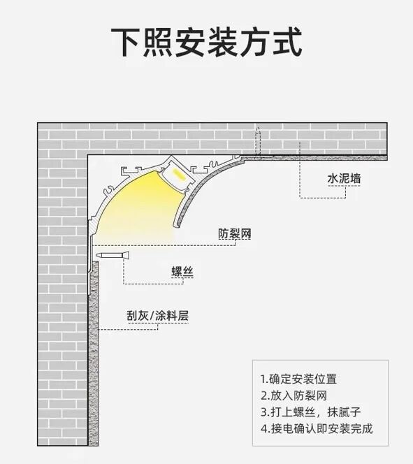 为什么这么说?首先,它不用吊顶、不用开槽、预留灯线,直接装在立面,螺丝固定,批上腻子即可!