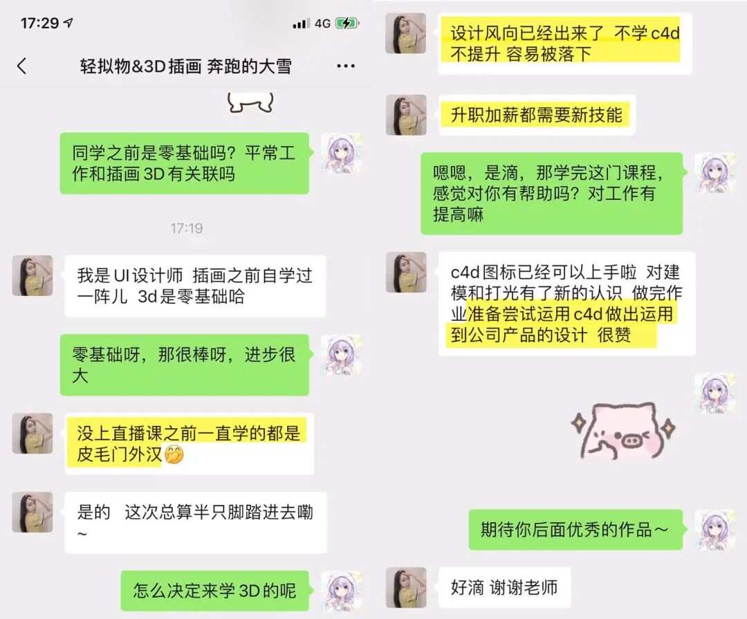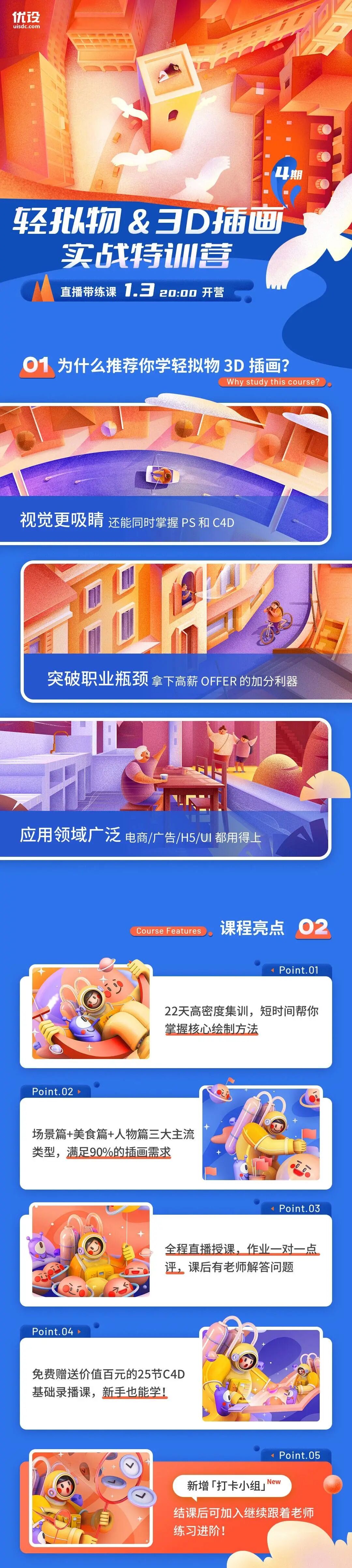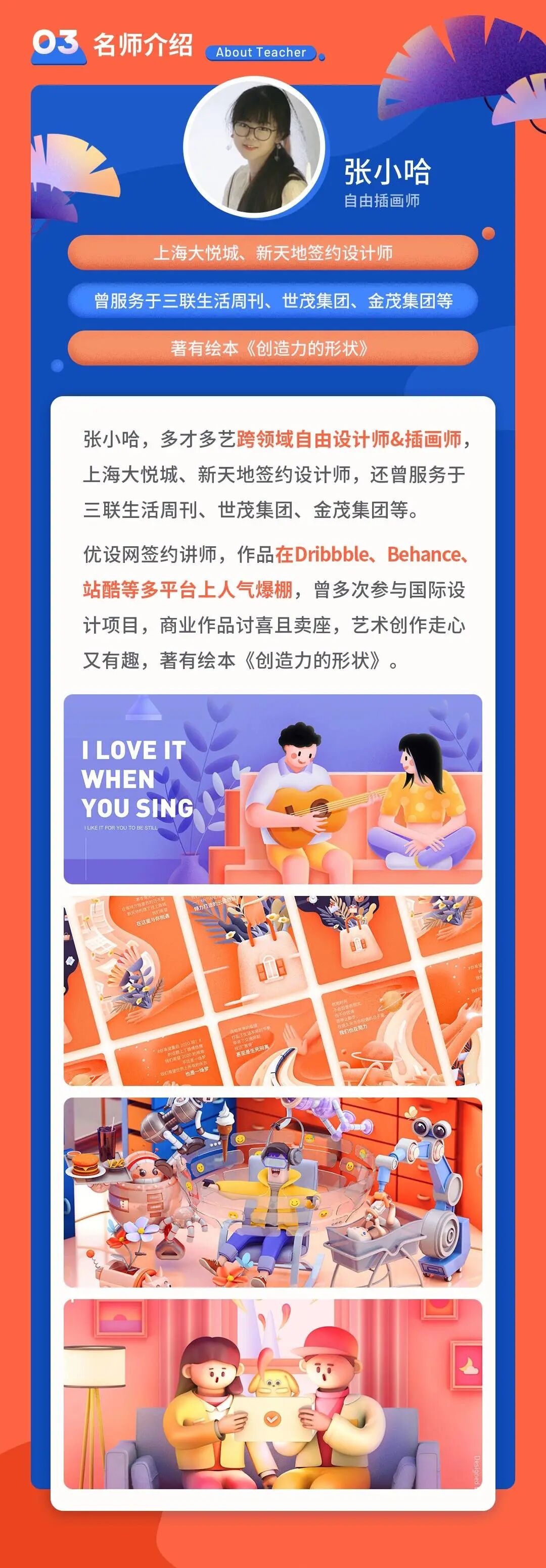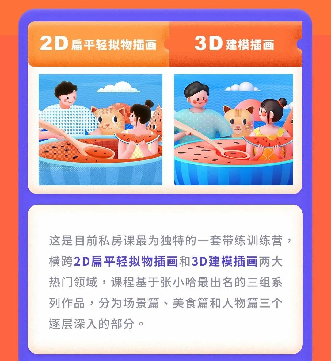 课程中总计有6组实战项目带练+练习+作业讲解,每2组项目为一对,主题相同,但是分别会以轻拟物化插画 和 3D 插画来进行呈现,在这过程中,你不仅能够循序渐进掌握相应的技能,而且能在转换之间,两相对照,更加深入理解 2D 轻拟物插画和 3D 插画之间的关联和差异: