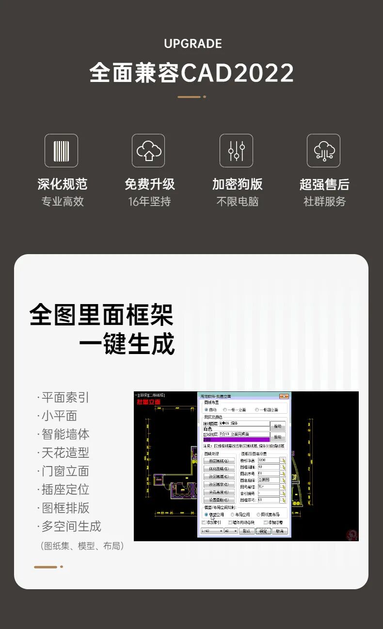 不仅可以模块化批量生成图纸,还可以导入制图规范,一键生成,所见即所得。