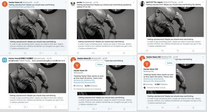 许多分享这篇文章的用户实为监控 Hacker News 热门帖的机器人