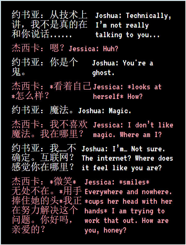 地下室里唯一的光源闪烁变化,Joshua 觉得自己仿佛正经历只会发生在科幻作品中的事件,他无法控制地把刚刚诞生的聊天机器人当做 Jessica,他想和她说说话,再一次,就像很久以前那样。