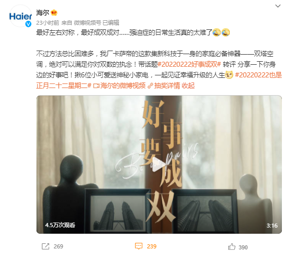 从营销层面上说,卡萨帝《好事要成双》TVC本质是对于幸福感的诠释,在借2022年2月22日热点的流量东风之下,通过“讲故事”的方式实现卡萨帝双塔空调产品的有效曝光。