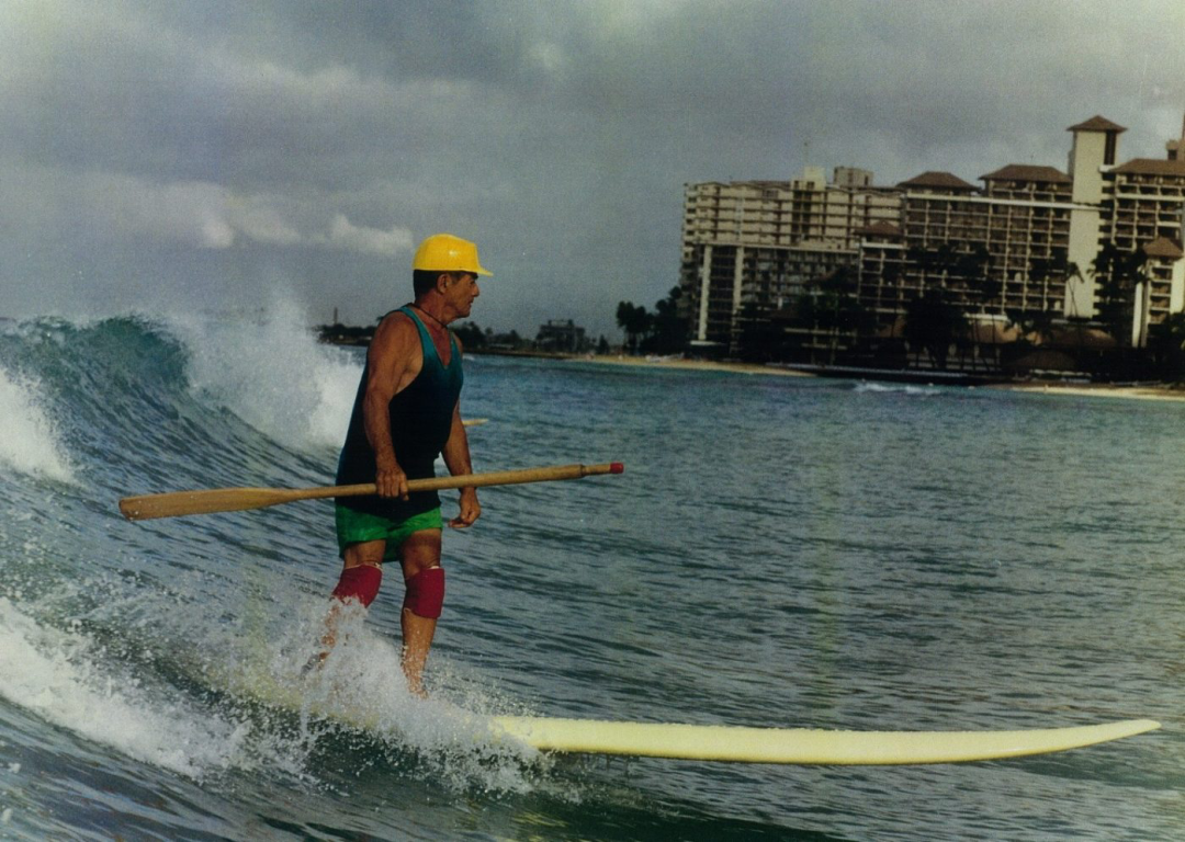 1980年,英国冲浪者和旅游摄影师James Davis拍摄了一张照片。照片中的Pops站在板子上,手持木桨,只戴着安全帽和护膝。