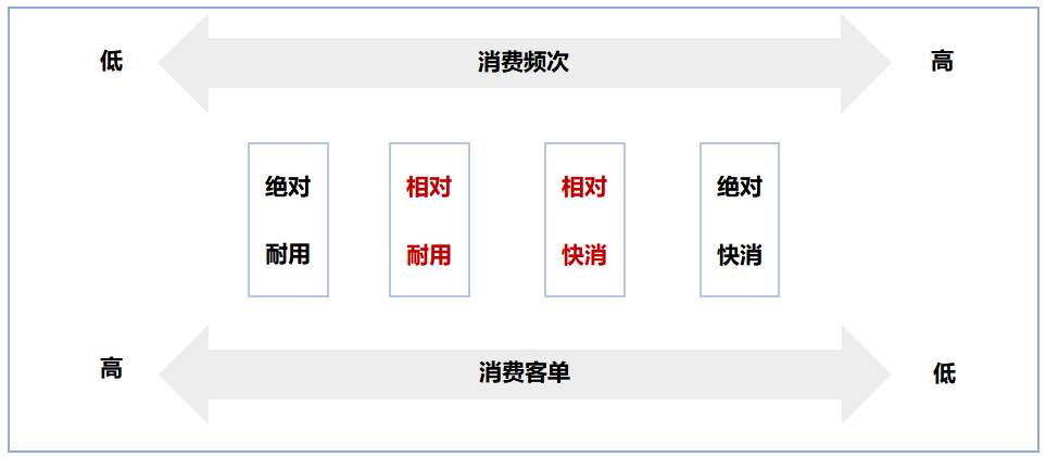 阿里巴巴前CEO卫哲把消费品分为绝对耐用、相对耐用、相对快消、绝对快消四大类(通俗来讲,相对快消为“不吃不用也没关系”的消费品,如奶茶、零食、化妆品等;相对耐用为小家电、衣服、包包等)。
