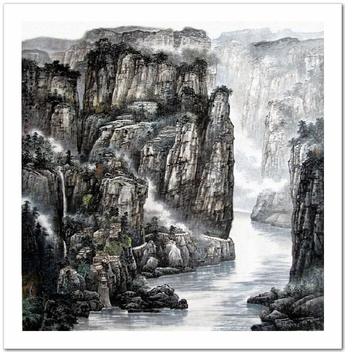 于守义研习传统山水画艺术,在“重振汉唐雄风”的创作精神指引下,一手伸向传统,一手伸向生活。多年来,他深入浩气千里的太行洪谷,体验真山水之云气烟岚、风雨阴晴、层峦叠嶂、浑厚华滋的气象,写生大自然,解读大自然。太行的雄厚,华山的奇伟,衡山的别岫,泰山的苍浑,都取诸其神,遍历广观,在年复一年的积累中,逐步确立自己独立的画品和风格。于守义的山水强调山势结构,注重山水的生命感,其笔下山水不仅形似,还有“骨气”,他把结构变成生动的形象,然后落笔成形,从文化的角度和精神的层面去发现新的创造灵感,以及由此而带来的新的语境和范式。