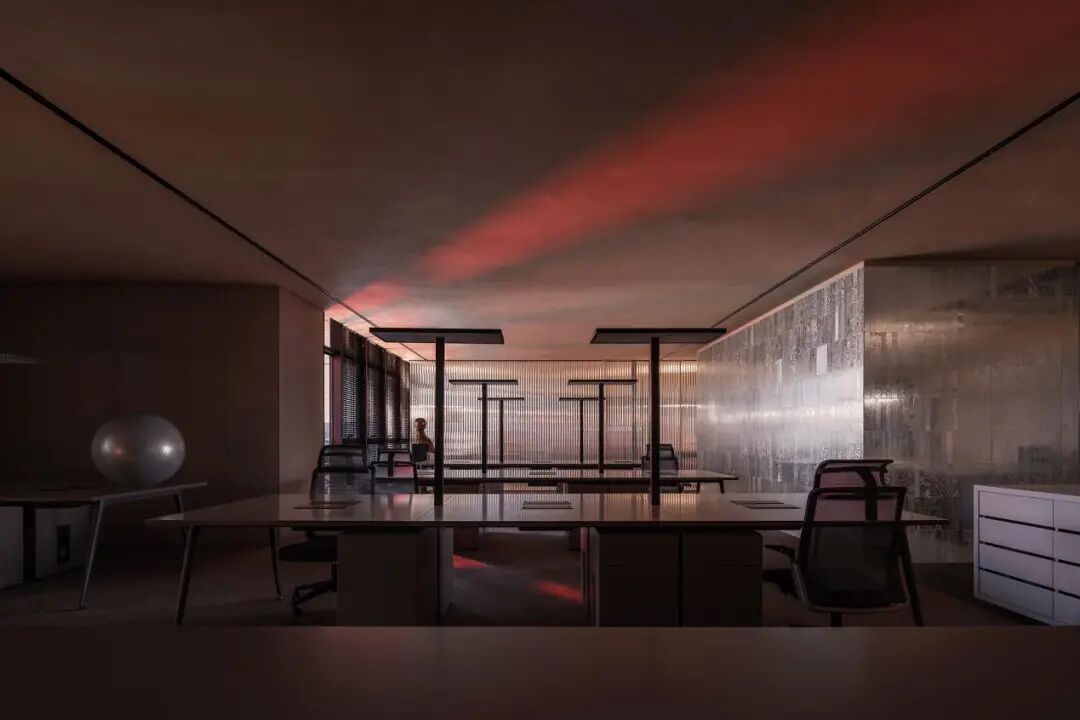 摇曳的自然光影与未来科技金属元素的双重畅想,建立使用者与空间的精神联系并增强其空间体验感。时间被煨煮成一种艺术,光影被赋予一种韵律,自然而然发酵产生新的秩序,孕生出极具新意的设计美学。