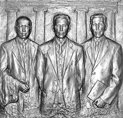 △东南大学浮雕铜像:童寯(左)、杨廷宝(中)、刘敦桢(右)。
