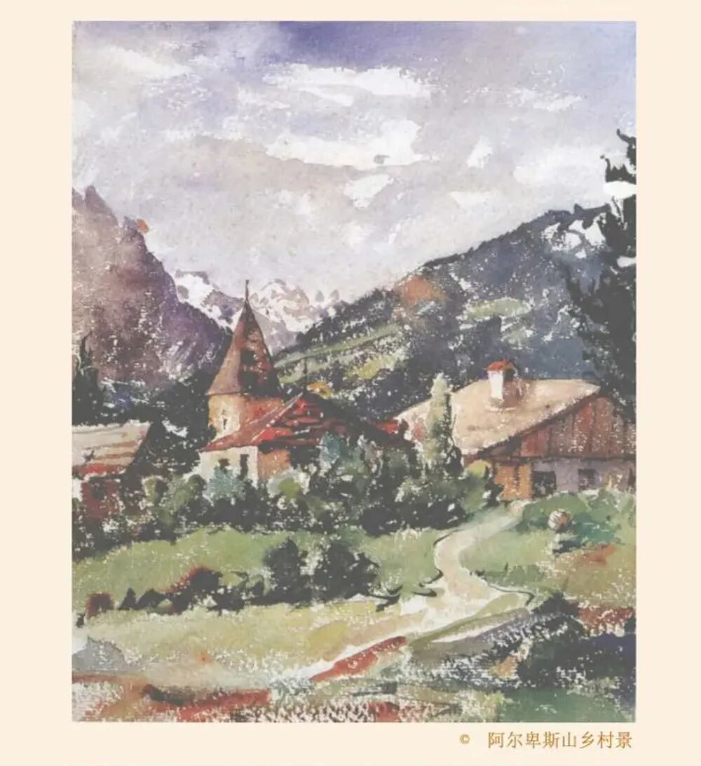 △童寯水彩画《阿尔卑斯山乡村景》。