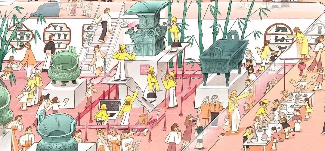 看到这里不得不说,非常开心西朴可以选择这样一个题材,并创作了一幅质量上乘的佳作。她巧妙且适度的将插画的超现实重组表达与那些和我们有所关联的古文物以及看展体验相结合,构建了一个容纳多款国宝文物的超级博物馆。
