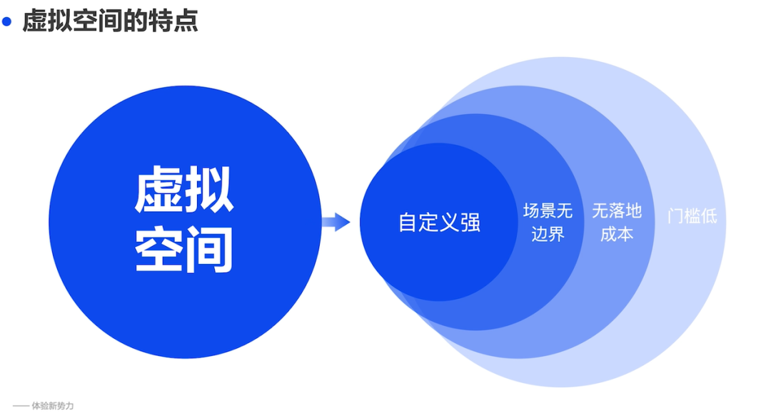 首先我们需要明确的概念是什么叫做“虚拟空间”,王亮对其特点进行了系统总结,分别是:自定义强、场景无边界、无落地成本、门槛低。