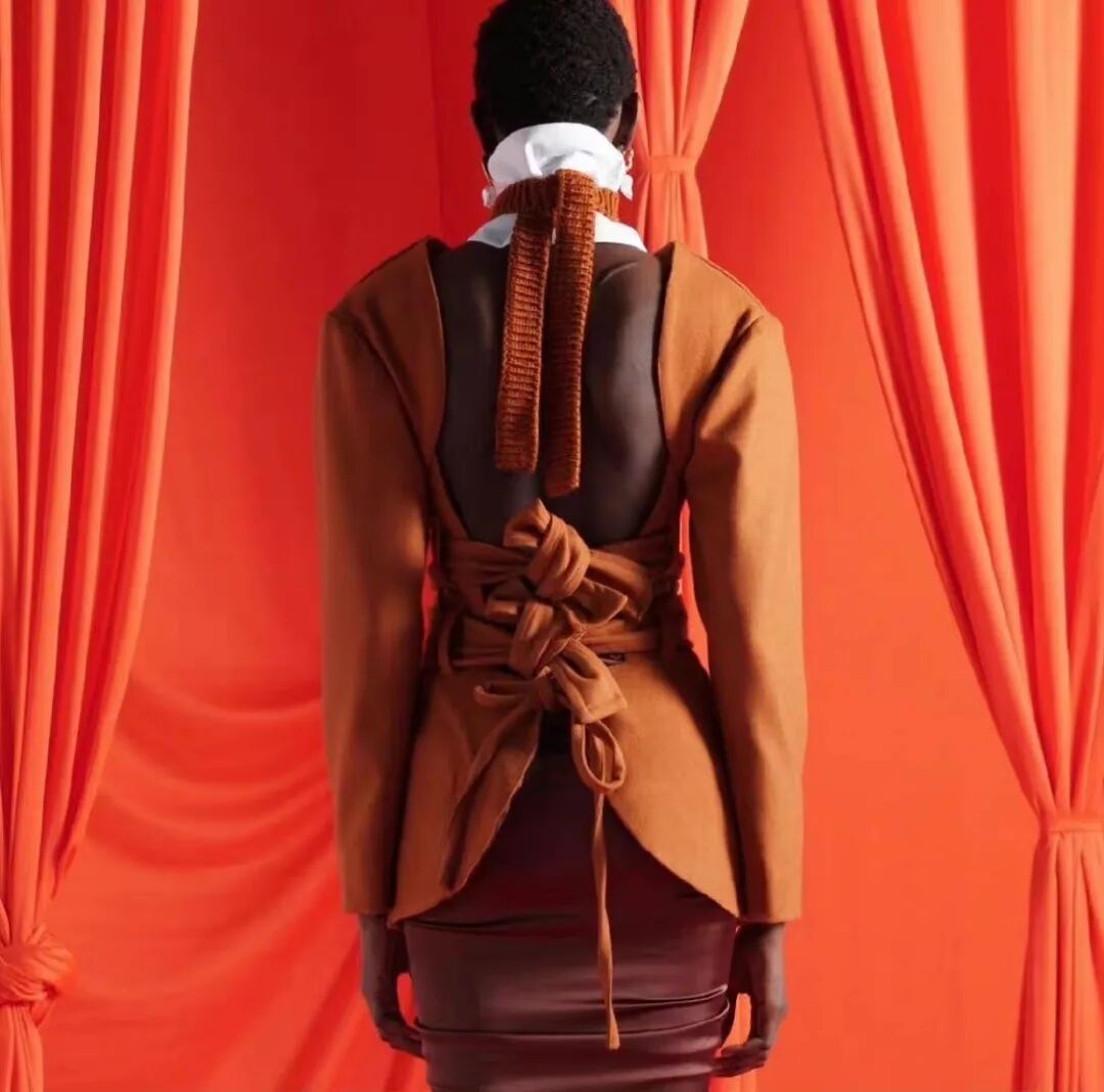 Richard Malone 力求利用多元化的剪裁手段来挖掘时装造型的无限可能性, 分割、悬垂、褶皱、缠绕,层出不穷的创新设计,碰撞出奇妙的火花,探索身体与织物之间关系的实验。