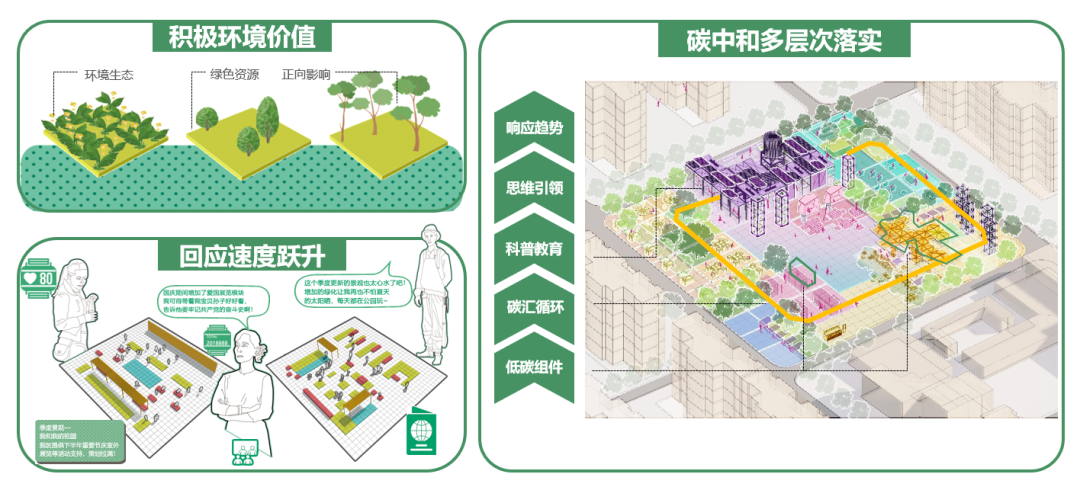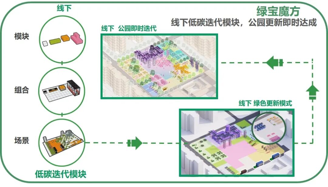 线下“绿宝魔方”运用模块化景观组合功能场景,添加低碳元素,让场地弹性迭代,减少公园改建的碳排放。